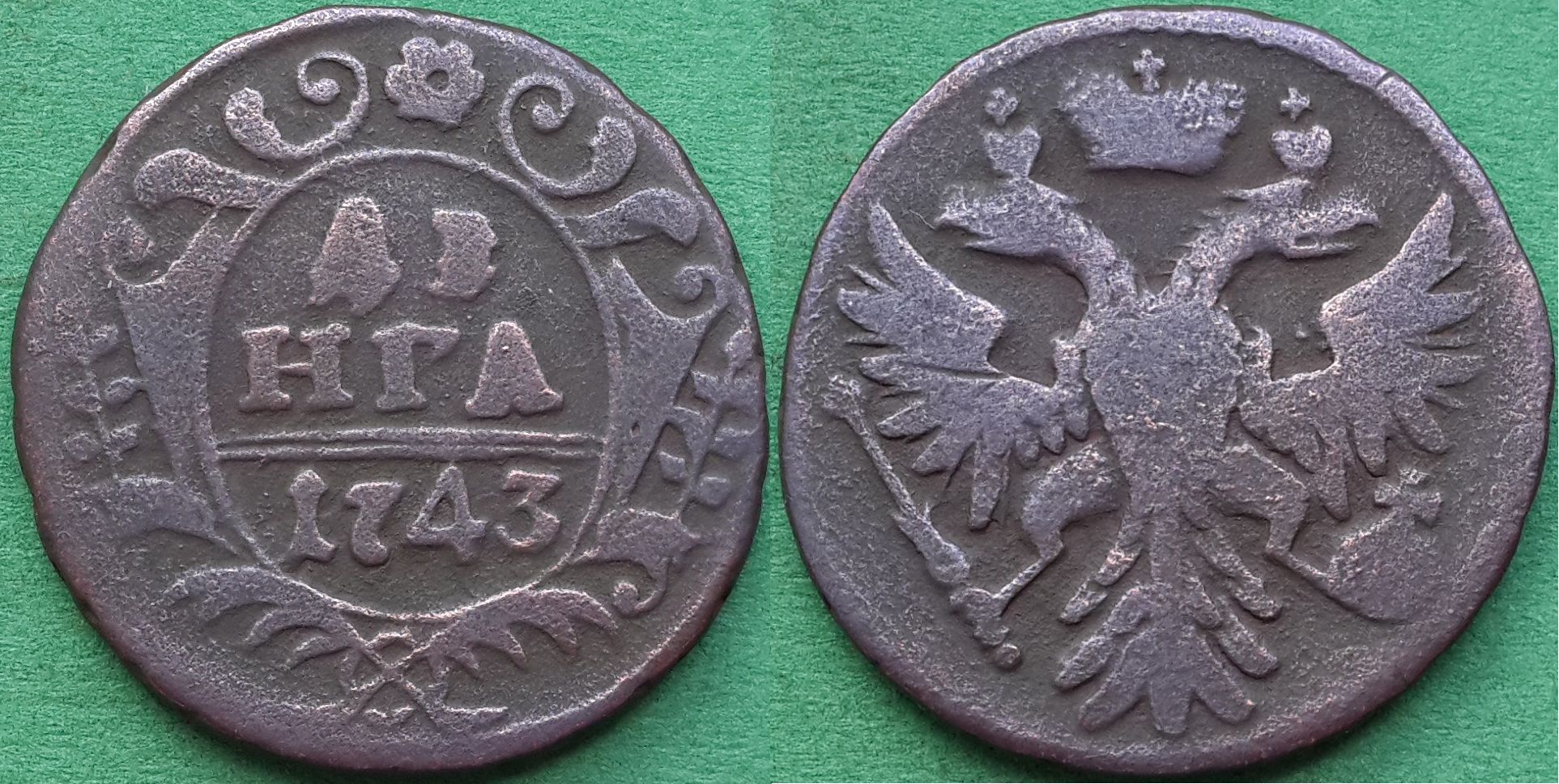 Уважаемые коллеги. У меня имеется деньга 1743 года с Большим Екатеринбургским орлом, у которого в хвосте видится 8 (4-1-3 перьев).