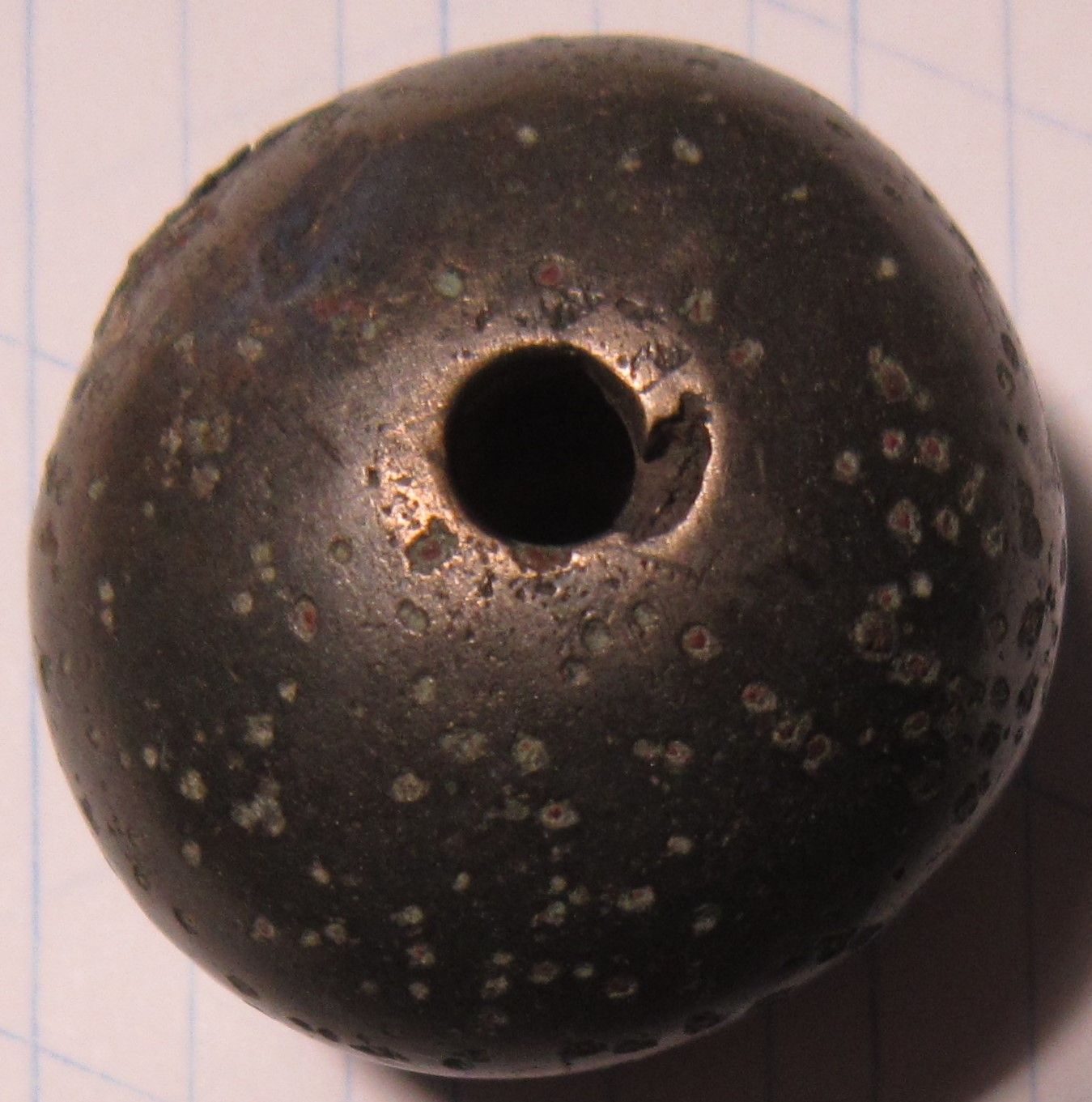 Бронзовый кистень 7-10 век Вес: 132 г. Диаметр: 32 мм. С долевым каталом, бронзовый корпус. У входного отверстий - магнитится, очевидно вставка железная Цена-860 гр