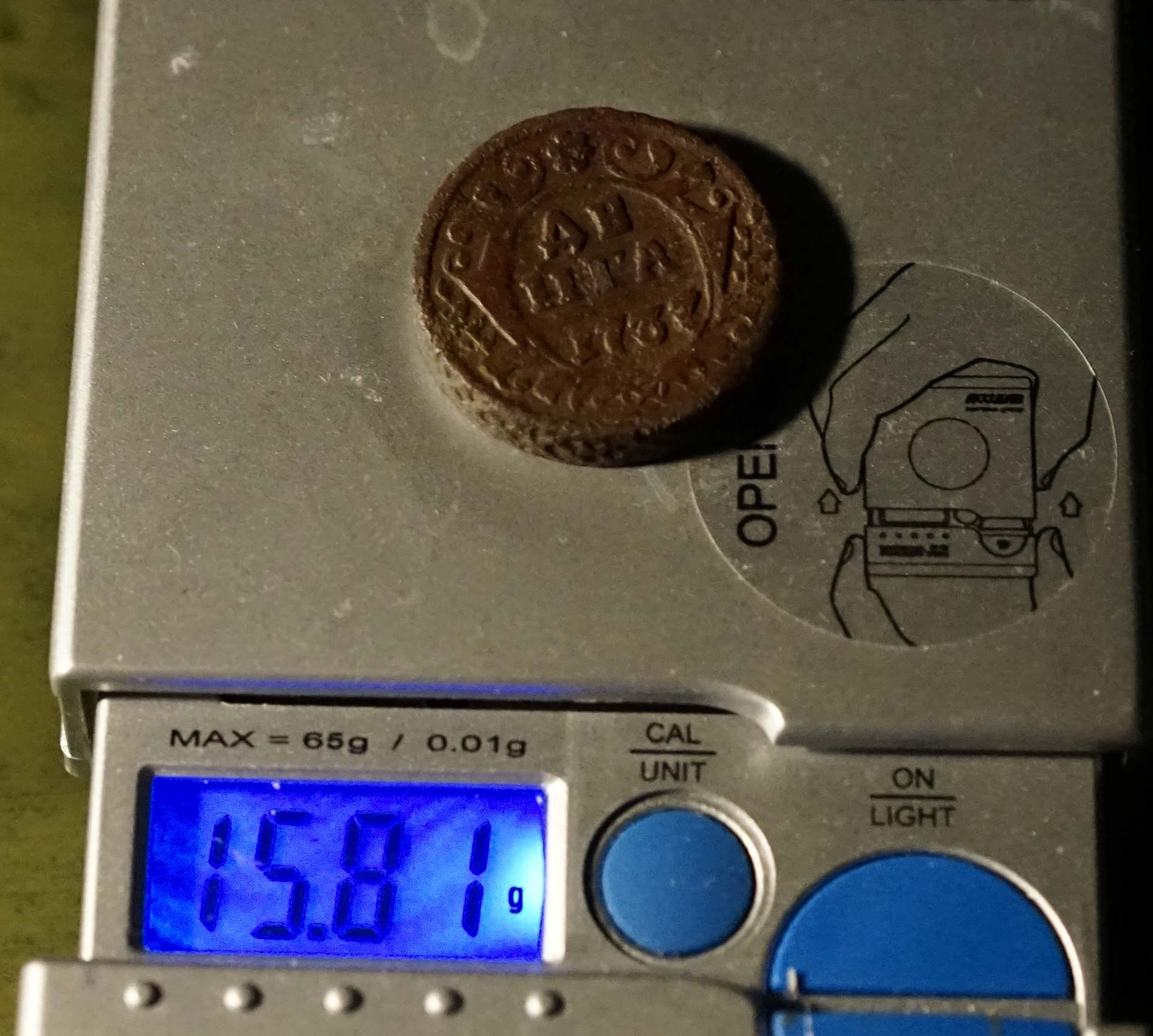 Доброго вечера. :) Рекордсменка в перевесе 1738 года среди деньги выпуска Екатеринбургского монетного двора с весом в 12,41 гр., который составляет 151,53%, от установленного среднего веса для деньги в 8,19 гр. Взвешивание проводилось на лабораторных весах. Фото прилагаю. :hi: С уважением.