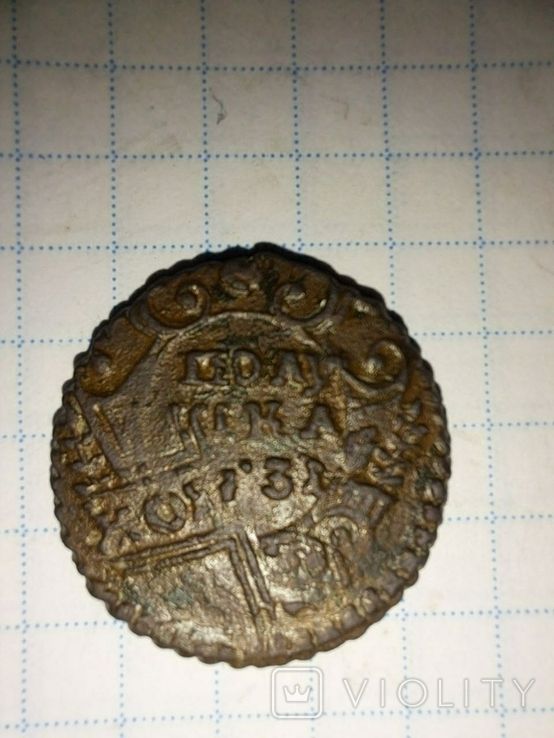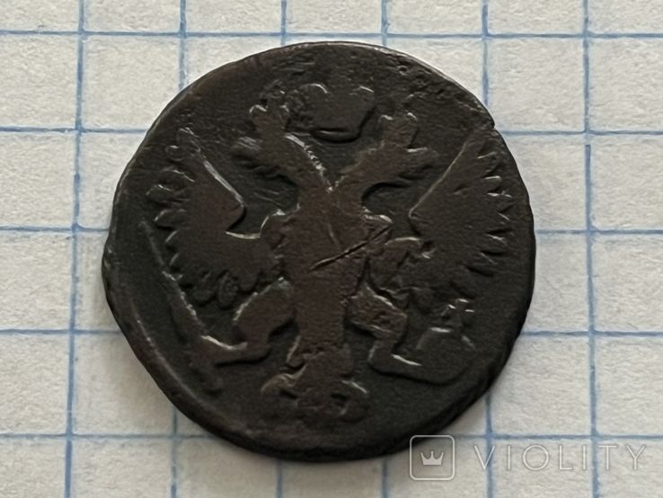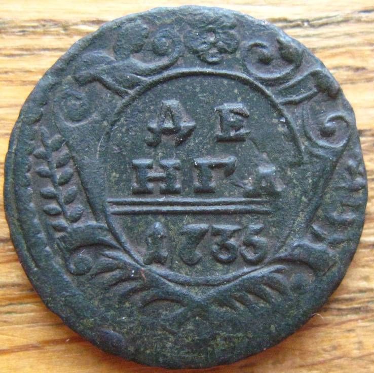 Проход на украинском аукционе 02.12.2023 года, Деньги 1735 года. Выпуск Плащильная мельница на р. Яуза, г. Москва. Реверс,- перевязь банта состоит из 3-х сегментов. С правой стороны сегмент перевязи банта отсутствует. Со старта в 1 грн., через 69 ставок финиш за 760 грн. Монета кладовая с хорошей деталировкой. Фото прилагаю.