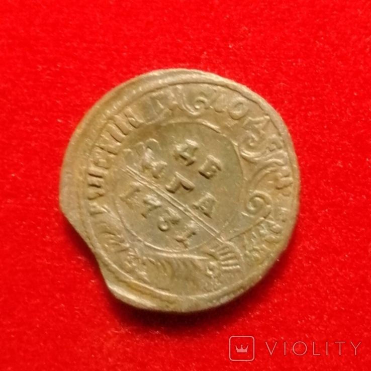 Перечекан деньги 1731 года из копейки Петра Алексеевича, с явными следами.
