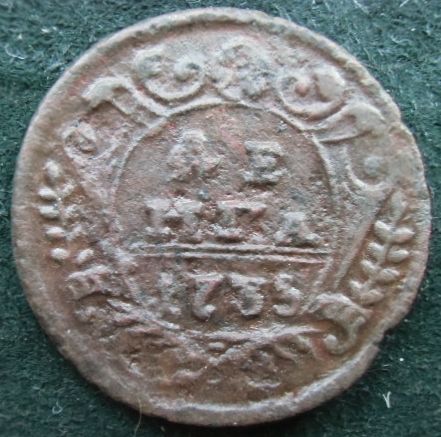 Для ценителей редких разновидностей деньги 1735 года. Одна из самых редких разновидностей деньги 35-го, ЦФН №29, реверс 1-го шаблона с двойными арабесками. Фрагмент технологической цепочки перехода штемпелей из 3-х монет, представленных 2-мя штемпелями аверса и реверса, переходящими в пары, после выхода из строя (поломки, выкрошки), одного из штемпелей.