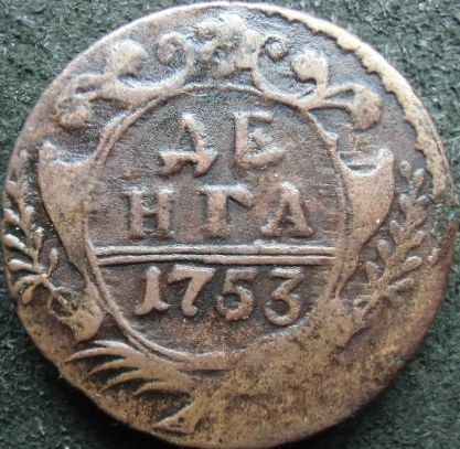 Доброго вечера. :) Рекордсменка в перевесе 1753 года среди деньги выпуска Красного монетного двора с весом в 10,87 гр., который составляет 132,72%, от установленного среднего веса для деньги в 8,19 гр. Взвешивание проводилось на лабораторных весах. :hi: С уважением.