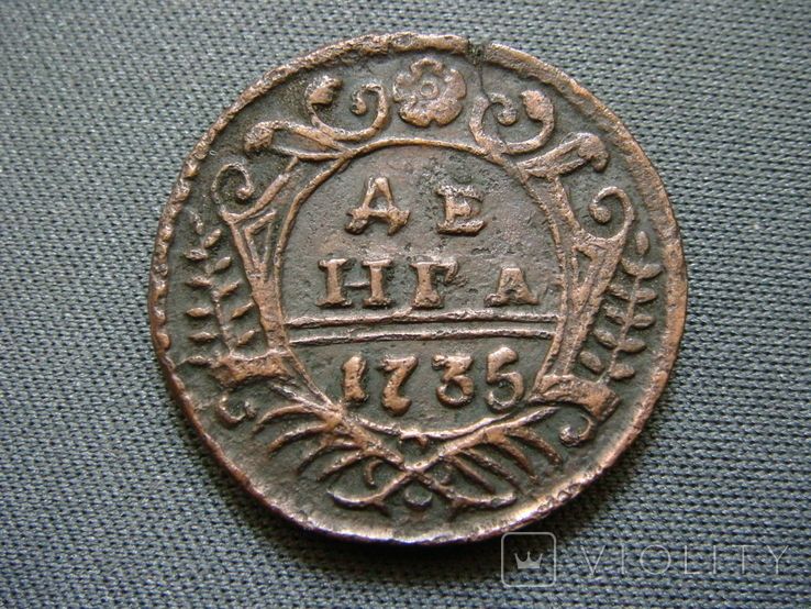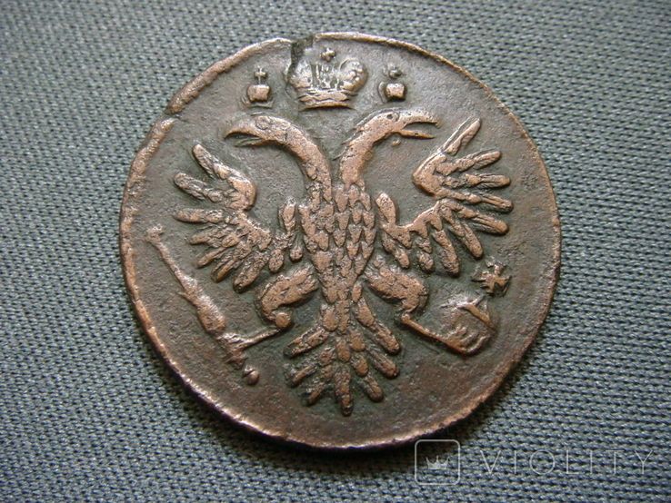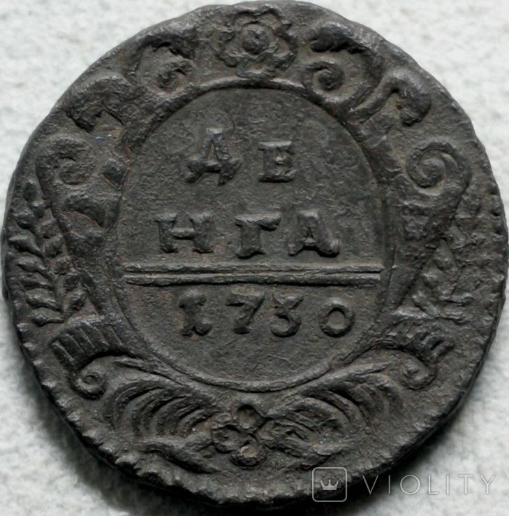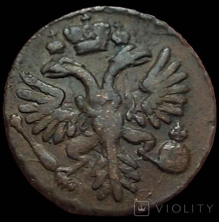 Руководство ЦФН классифицирует эту разновидность деньги следующим образом: №63 - аверс: орёл образца 1730г., девять перьев в одном крыле и десять в другом, хвост орла - по три ряда перьев с каждой стороны, крест державы простой, реверс: внешаблонный, розетка образца 1731г., пятилучевая, необычной формы, (в народе "медуза"), боковые ветви - по десять листочков с каждой стороны, нижние ветви пальмовые с обвязкой (бантом), надписи номинала и года выполнены нестандартным шрифтом, монета встречается редко. Фото и выписку из Руководства ЦФН прилагаю. :hi: С уважением.