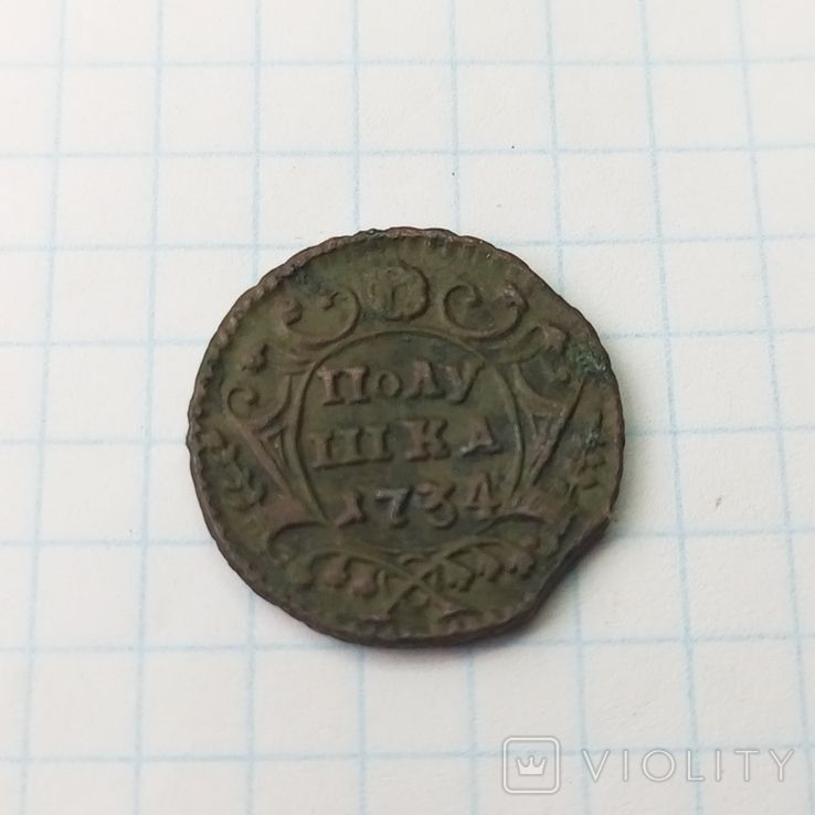 Доброго вечера. :) Недавний проход полушки выпуска Красного монетного двора 1734 года. Малые короны без крестов. Гурт шнуровидный. Со старта в 1 гривну с ценой в 100 грн. Монета из земли. Проход на украинском аукционе 15.10.2024 года. Фото прилагаю. :hi: С уважением.