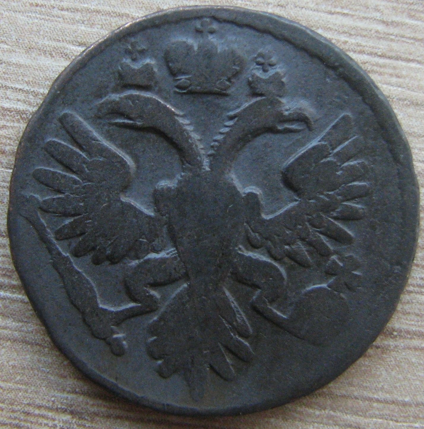 Ще одна монета 1734 року, начебто нічого цікавого. Хоча я брав її як цікавий вид. Вона була під слоєм грязі і реверс читався як з особливою розеткою, а аверс, вісім і десять пір'їнок у крилах. Ну а коли змив грязюку то виявилося що нічого такого там немає. Але, виявився цікавий брак, навіть незнаю як назвати цей перекос, по факту то роздільні риски набиті на вскось, це я так уразумів. Що скажите шановне панство?