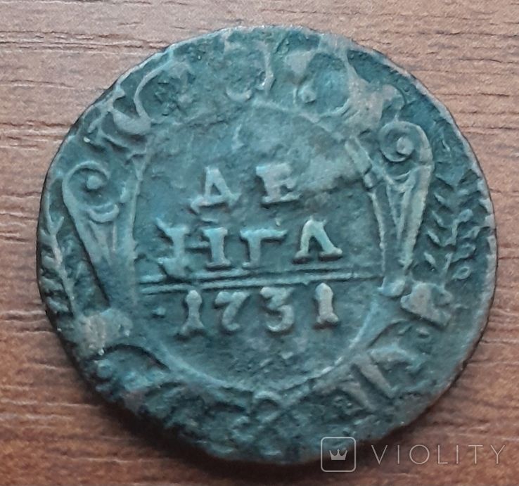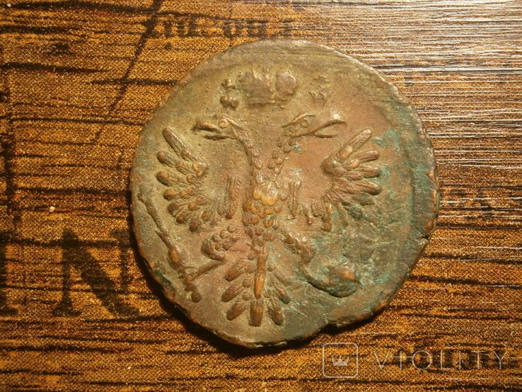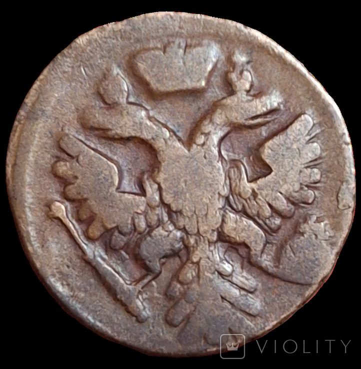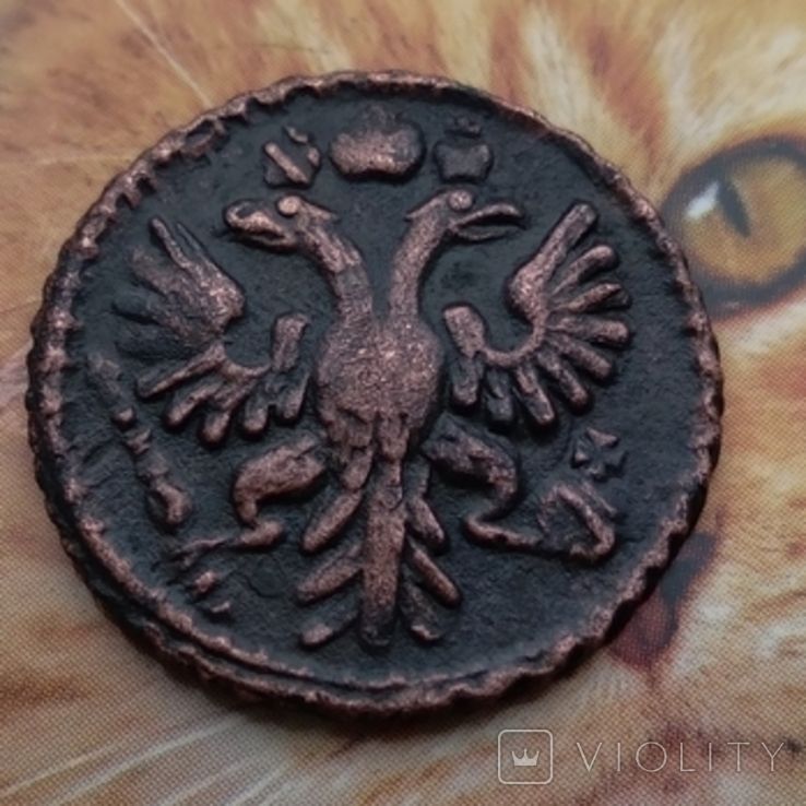 Руководство ЦФН классифицирует эту разновидность деньги следующим образом: 65 - аверс: внешаблонный, орёл образца 1731г., необычного рисунка (в народе "пьяный"), с остями в крыльях и хвосте, по семь перьев в каждом крыле, хвост орла - по два ряда перьев с каждой стороны, реверс: шаблон №1, розетка образца 1730г., пятилепестковая, боковые ветви - девять листочков с одной стороны и двенадцать с другой, нижние ветви пальмовые с обвязкой (бантом), монета встречается редко. Фото и выписку из Руководства ЦФН прилагаю.