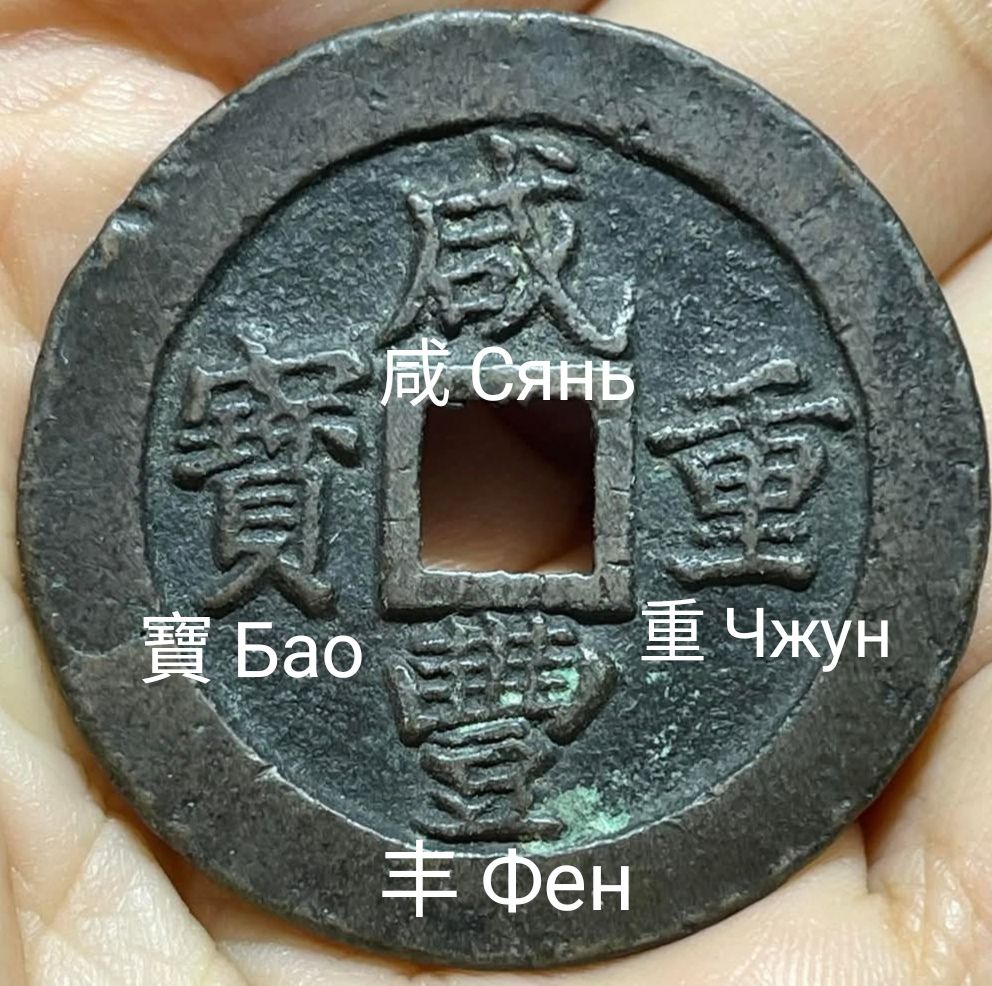 Читання напису монети 1850 - 1861 рр. 咸丰重寶 номіналом 10 цяней.