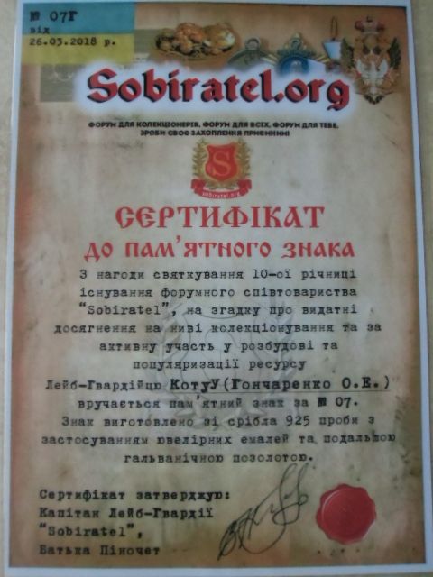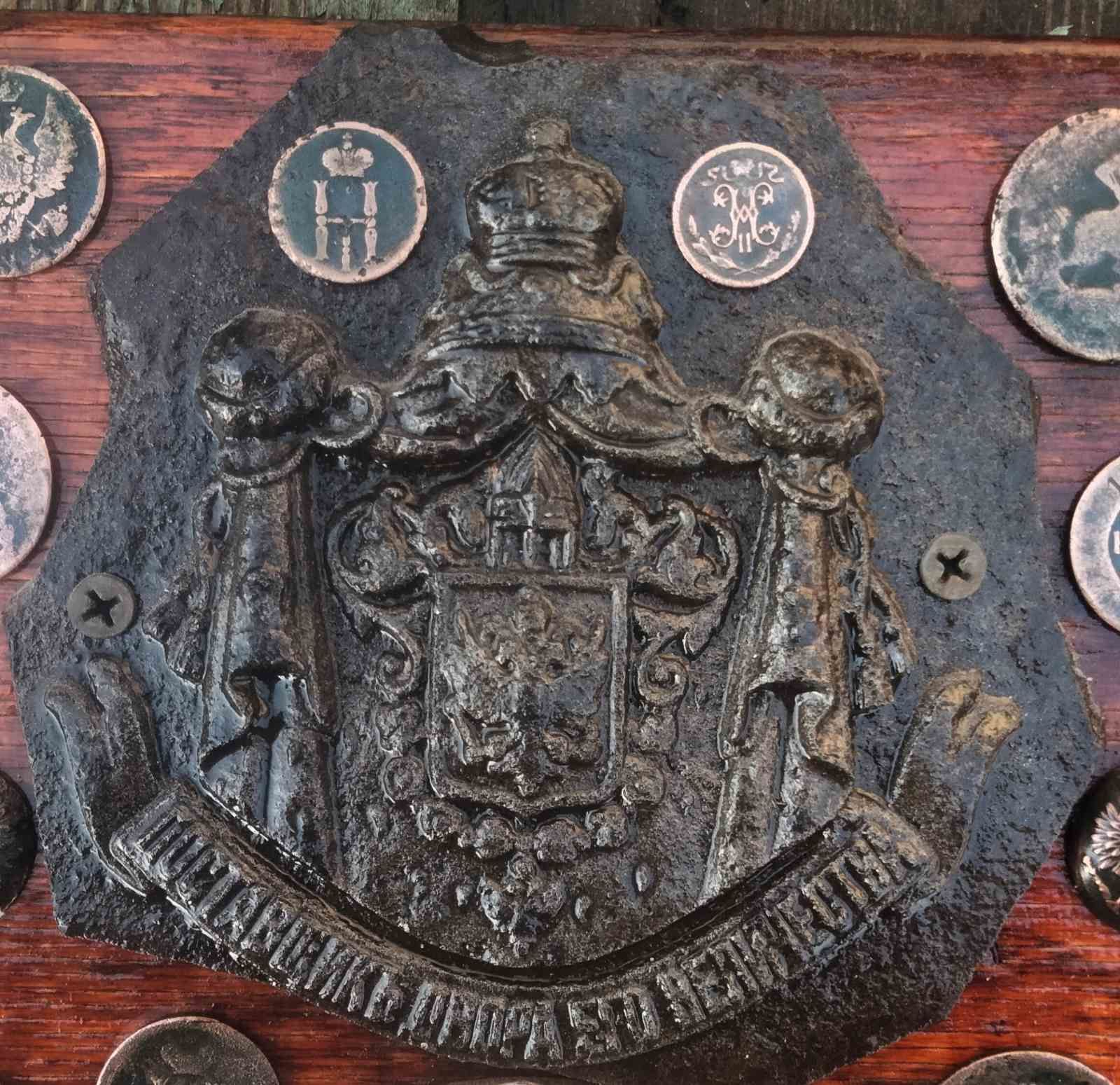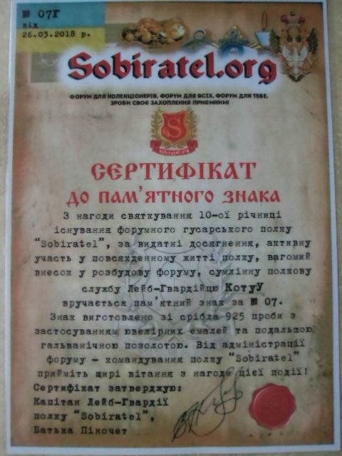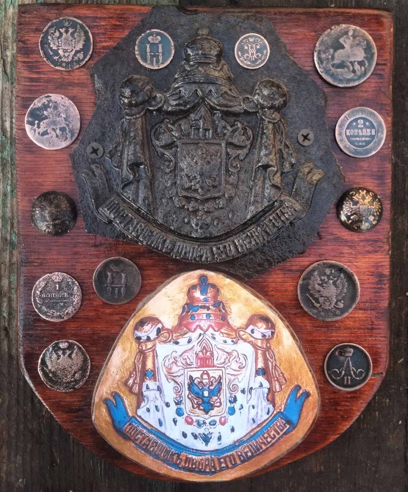 Колись в кінці 90-х в кущах бузку прибор видав потужний і об"ємний сигнал. Почав вирубувати кущі і на пів-штика лопати глибини видобув чавунну плиту 1,5 см розміром близько метр на півтора. А на плиті.... в куточку, ось цей герб! Молотком відбив, забрав. Довго він лежав на поличці. Почистив, були залишки фарби, такі, як на малюнку з мережі. Знайшов інфу по знаку і званню. І в результаті з"явився ось такий стенд. Зверху - оригінал, знизу - кольорове фото знака, яким він був при житті. Розфарбовувати оригінал вважаю, що не варто. Монетки і пуги додають композиції своєрідний позитивний шарм. Коротше - "я - художник, я так бачу і мені так подобається!"