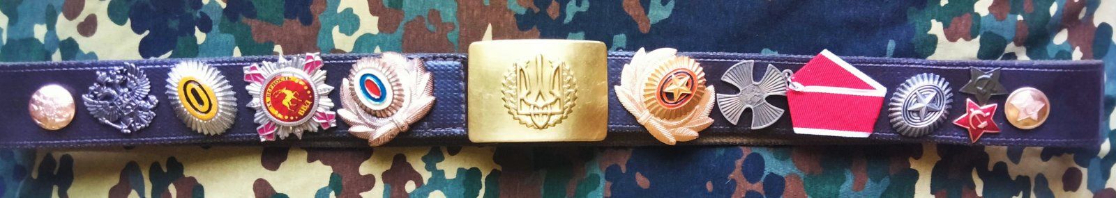 В мене також піднабралась добірка подібних трофеїв - підарські нагороди, кокарди, гудзики. Армійські, мусорські, кізячества їхнього... Сучасні та часів совка (полюбляють вони подібну тематику) . Більшу частину їх особисто зняв з сєпарні і москальні, частину підігнали бойові побратими. Вирішив і я оформити такий Ремінь. Зробив. Прикріплю на стіні нижче Бойового Прапора мого підрозділу.