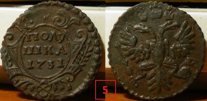Доброго вечера. :) Вашу полушку можно классифицировать, как ЦФН №5, одноштемпельную по реверсу, но не одноштемпельную по аверсу. Фото ЦФН №5 прилагаю. Классификация в Руководстве ЦФН: 5 - аверс: орёл образца 1730г., крест державы простой, реверс: арабески двухзавитковые, розетка образца 1730г., боковые ветви по девять листочков, единицы в дате с верхней горизонтальной гастой, монета встречается реже, может встречаться с другими видами аверсов. К редким разновидностям она не относится, но для любителей специфических штемпельных разновидностей (нестандартное написание цифры "1") и построения технологических цепей (ТЦ) будет интересна. Стартуйте с не высокой цены. :hi: С уважением.