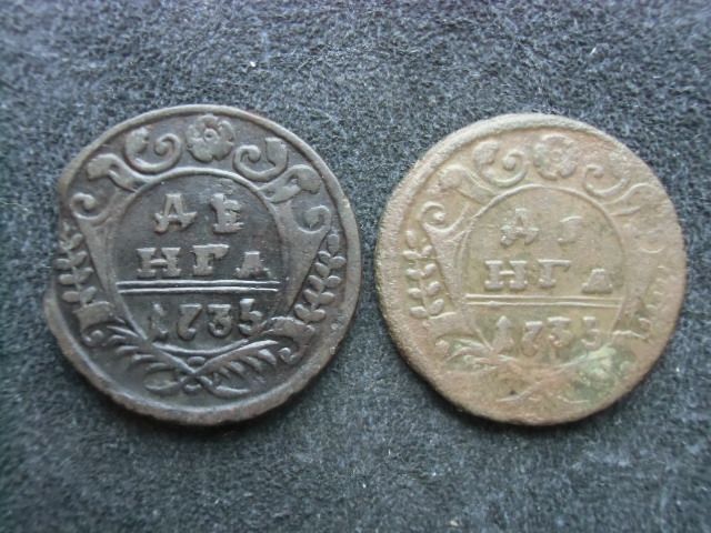 Два одноштемпельных перечекана деньги 1735 года (ЦФН) с разной степенью сохранившейся детализации штемпелей, не подвергшимся изменениям в рисунке из-за наложения на рисунок копейки Петра Алексеевича. Фото приалагаю.