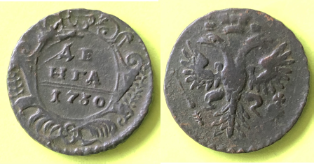 - 45-3. Денга 1730, розетка 4 лепестка - цветок, необычный скипетр, ЦФН №5