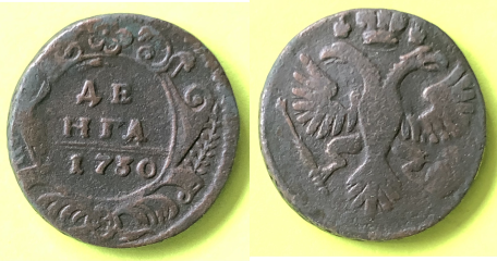- 44. Денга 1734 года Орел с хвостом 4-1-3