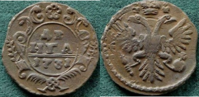 43. Денга 1734 года Орел с хвостом 4-1-4
