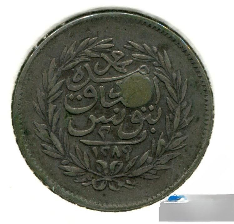 Тунис 2 пиастра 1873 (1289) надчеканка для Абдул Хамида