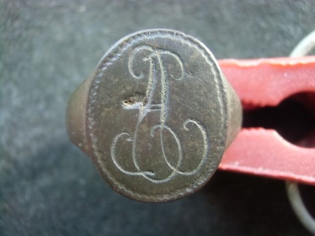 Доброго вечора. Подкажіть будь ласка информацию по перстню. Якщо можливо,, время изготовления и вероятное значение вензеля (имя или фамилия владельца). Имеет ли какую ценность, кроме исторической. Материал: медь с покрытием желтым металлом. Найдено в лесу в пригороде г. Харьков. Фото прилагаю. Заранее благодарю. З повагою.