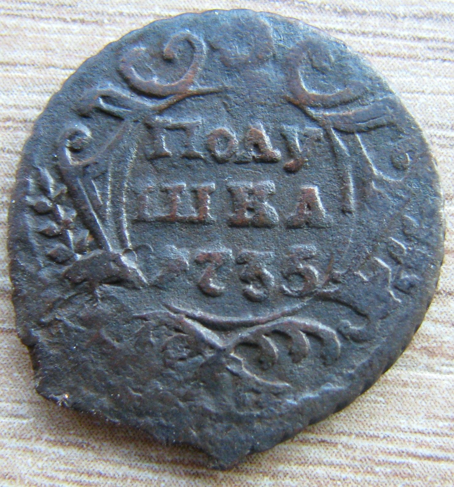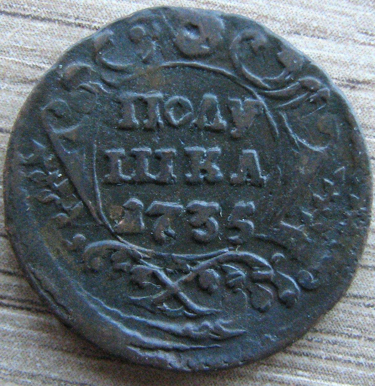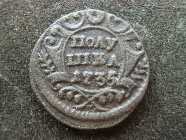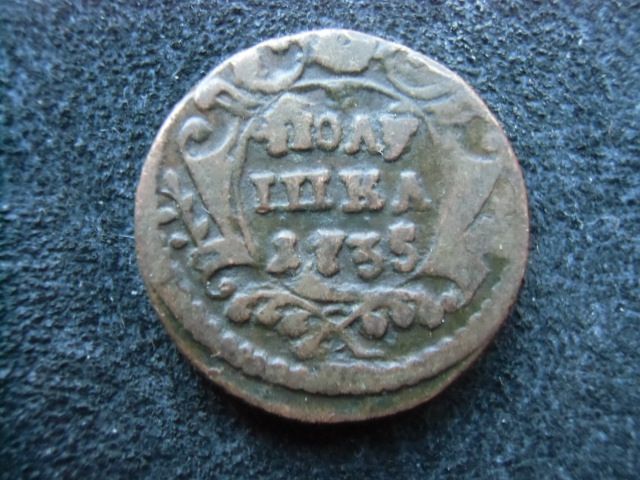 Доброго вечера Андрей. :) Одноштемпельной монеты не нашел, но нашел полушку с аналогичным реверсом, отличающимся только незначительными различиями в расположении и форме отдельных мелких деталей штемпеля. Штемпеля изготовлены одним мастером и одним инструментом. ;) Фото прилагаю. Относительно реверса Вашей монеты. Без одноштемпельного реверса не могу с уверенностью сказать о точном количестве листьев в лавровых ветвях из-за слишком большого количества изготовленных штемпелей полушки в 1735 году. :scratch_one-s_head: :friends: З повагою.