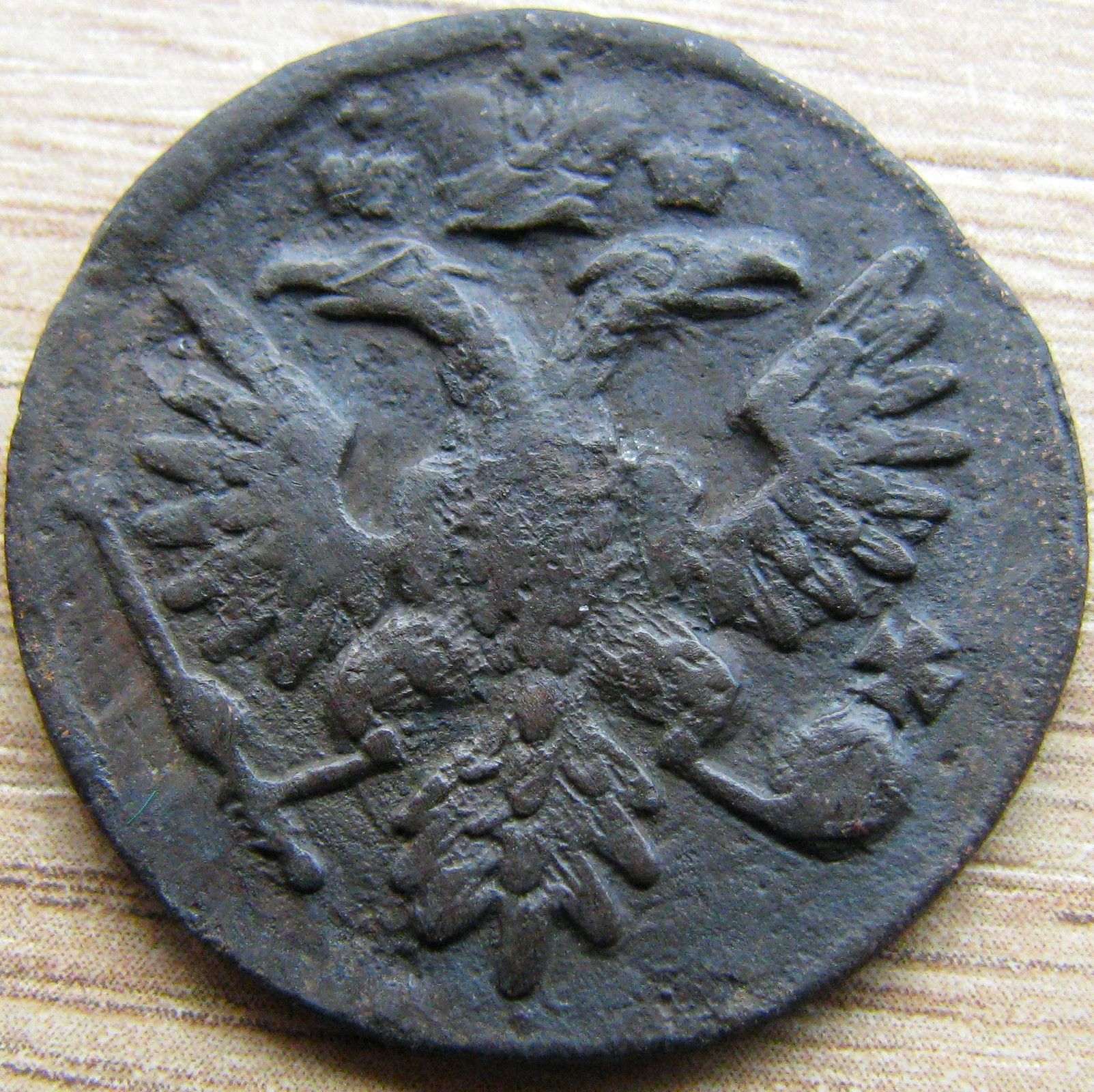 3-я монета: ЦФН№14 - аверс: орёл образца 1736г., (поздний), по восемь перьев в каждом крыле, хвост орла - по три ряда перьев с каждой стороны, крест державы простой,