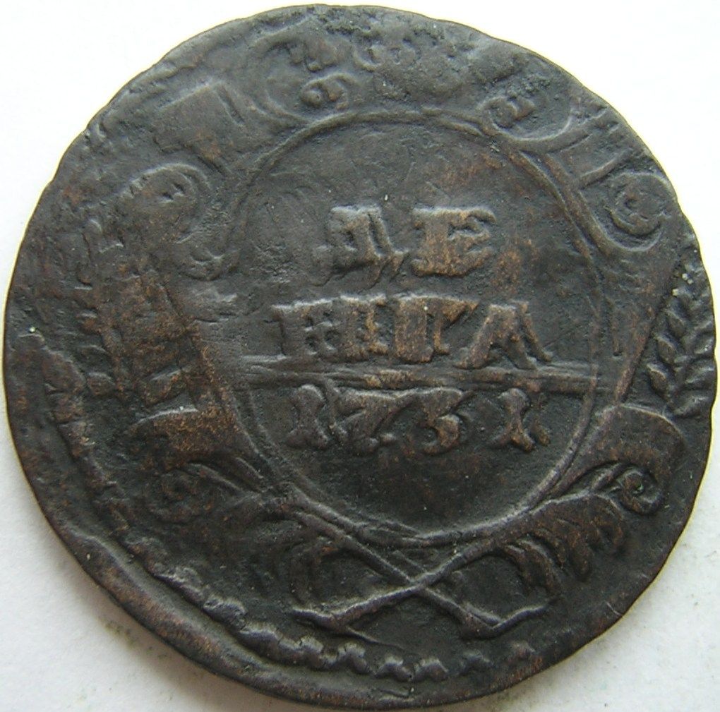 Деньга 1731 года, выпуска Красного МД. Сдвоенный реверс 1-го шаблона при тиснении монеты. Фото прилагаю.