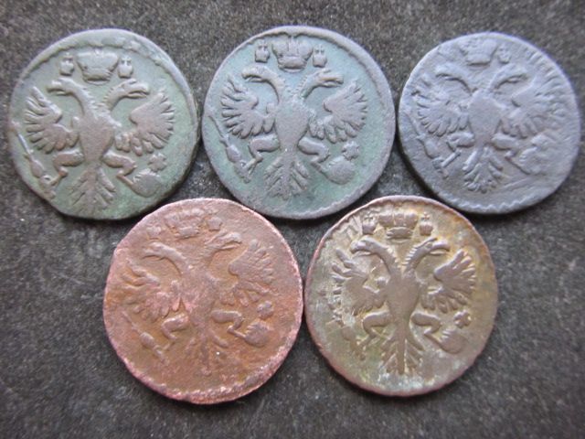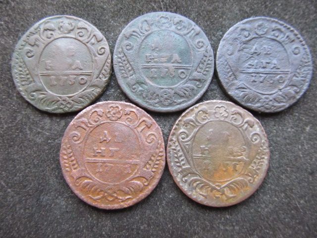 штемпелями реверса, 4-е из которых датированы 1730-м и 3-и 1731 годом. Групповое фото 5-ти монет и недостающие к ним две, ЦФН №10, 1730 года и ЦФН №23, 1731 года прилагаю.