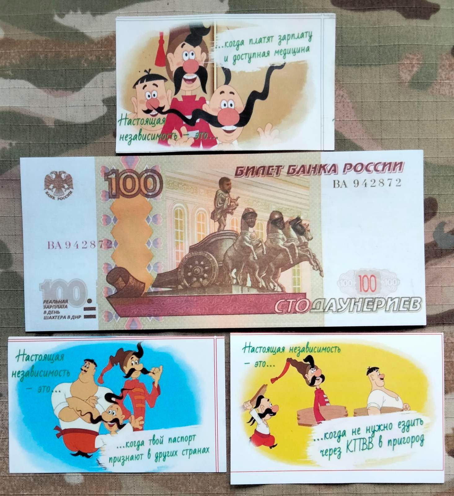 Агітаційні матеріали для сєпарів і москалів періоду АТО-ООС. В 2017 р. особисто споряджав ними червоні агітаційні снаряди 122 мм і в районі Світлодарська на повному заряді самоходки 2С1 “Гвоздіка” лупили на територію лугандонії.