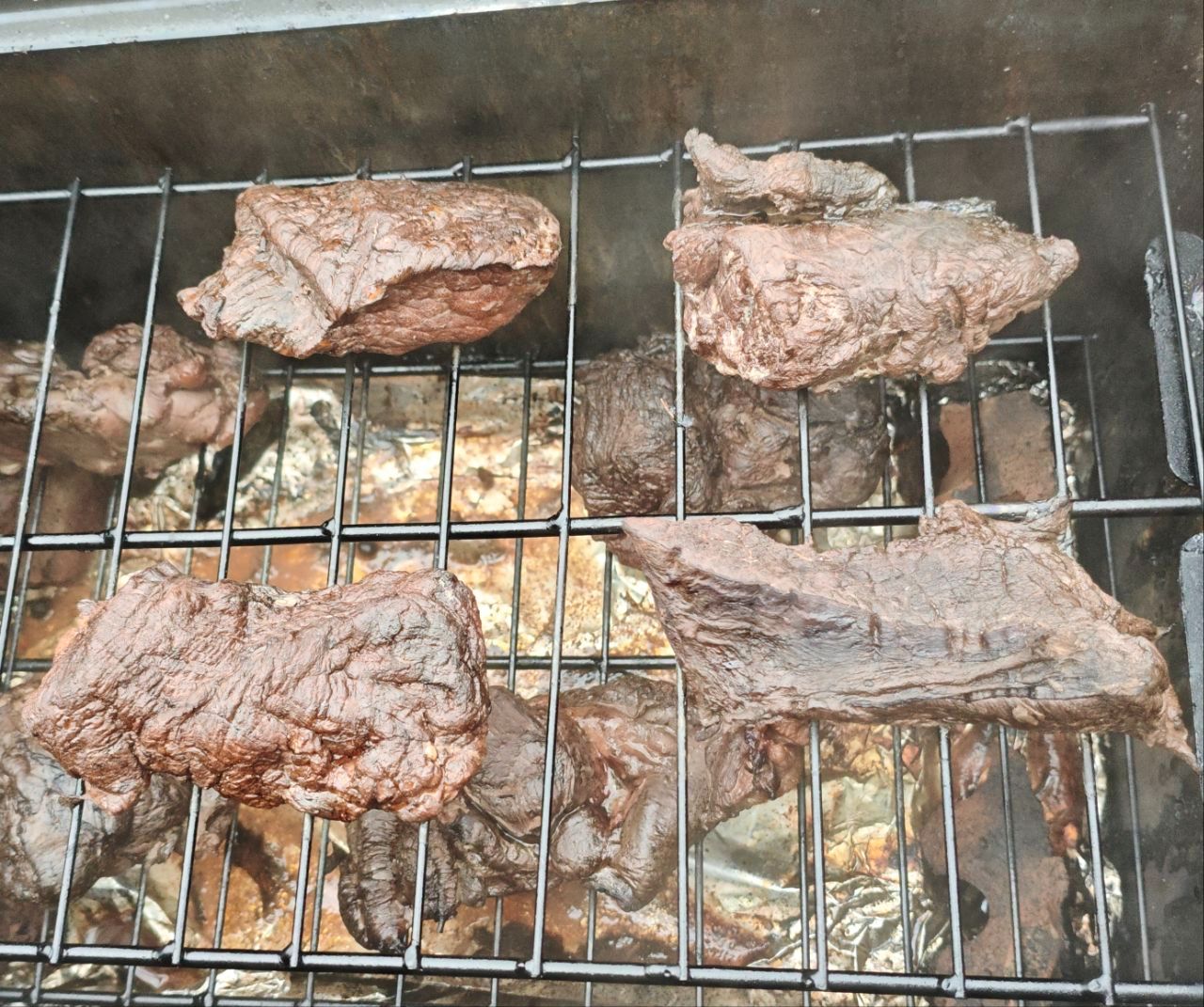 Поділюся простим але гарним маринадом для м'яса перед копченням. Маринад дуже чудово підходить як для гарячого так і холодного копчення. На 3-4 літри води: солі 3-4 столові ложки, цукор 1-2 ложки, перець чорний горошком, перець духмяний горошком, лаврушка, трохи гвоздіки, головку часнику(чистимо). Це все в одну посуду і закип'ятити, дати повністю охолонути, і заливаємо м'ясо(м'ясо попередньо години 2 вимочую в холодній воді з додаванням трохи оцту), тримати в холодному місці днів 2-3. Перед копченням м'ясо просушуємо, або добре витираємо паперовими рушниками. Для того щоб закоптити гарячим способом достатньо 40-60 хвилин.