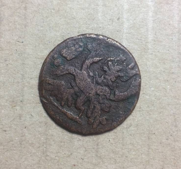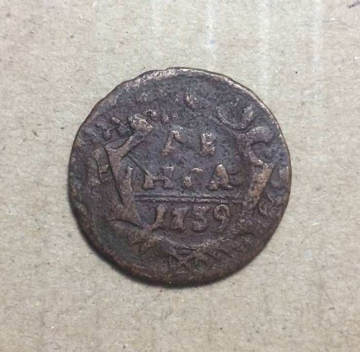 Деньга 1739 года, выпуска Екатеринбургского монетного двора. Зачекан монетного брака.