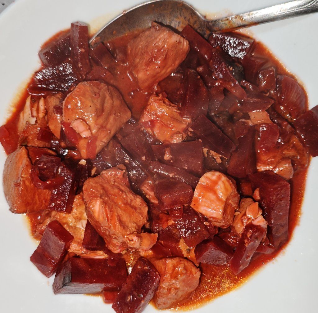 Ріжемо шматочками м'ясо та обсмажуємо, додаємо порізану цибулю і ще хвилин 5 обсмажити. Червоний буряк(на 0,5 кг. м'яса беремо 2 шт.), попередньо варимо або запікаємо в духовці, ріжемо і додаємо до м'яса, додаємо сіль і перець за смаком. Додаємо 1-2 ст. ложки томатної пасти, 1-2 ст. ложки сметани, 1 ч. ложку гірчиці, 200 грамів червоного вина(взагалі дана страва готується на буряковому квасі, але де зараз його взяти))), 2-3 ст. ложки оцту. Тушкуємо на повільному вогні. Додаємо трохи борошна і подрібнений часник, перемішуємо і ще тушкуємо хвилин 3-5. Дати настоятися хвилин 20. Смакота.