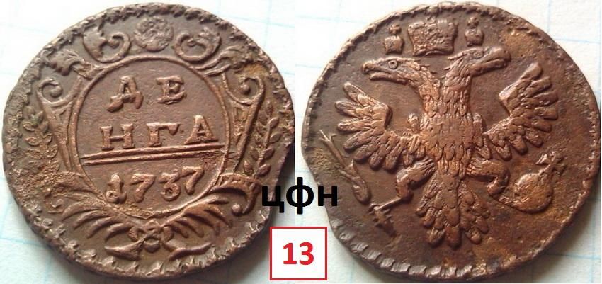 По причине изношенности штемпелей бывших ранее в производстве и прошедших передатировку, чистку и ремонт, состояние их отражается и на монетах, для которых их использовали повторно. Эти разновидности классифицируются следующим образом: 12 - аверс: орёл образца 1735-36 гг., девять перьев в одном крыле и десять в другом, хвост орла - по три ряда перьев с каждой стороны, крест державы простой, реверс: шаблон №6, боковые ветви - по семь листочков с каждой стороны, нижние ветви с обвязкой (бантом), передатировка 41-43, монета встречается намного реже и 13 - аверс: орёл образца 1736 г., девять перьев в одном крыле и десять в другом, хвост орла - по три ряда перьев с каждой стороны, крест державы простой, реверс: шаблон №6, розетка образца 1738г., шестилепестковая особого рисунка (в народе "гвоздика"), боковые ветви - по семь листочков с каждой стороны, нижние ветви с обвязкой (бантом), монета встречается намного реже. Фото и выписку из Руководства ЦФН прилагаю.