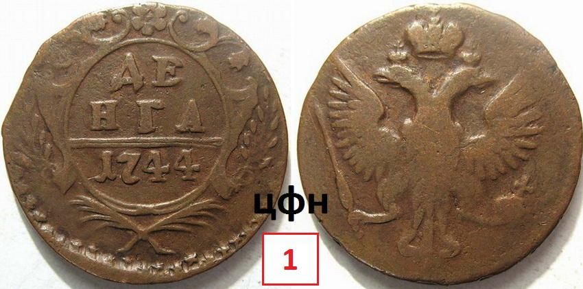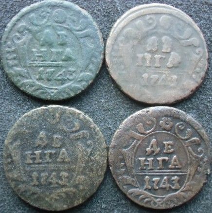 В 1743 году очередной переезд штемпелей для изготовления медных монет из Екатеринбурга на Красный монетный двор. 1743 год очень богат на разнообразие штемпелей и сочетания штемпельных пар в производстве деньги. Ранее мы уже отмечали ЦФН №17,,обозначенную в таблице А. Ковтушенко под №16. Еще можно отметить две разновидности проходящие в таблице Топ 50, под № 36. Денга 1743 с ранним орлом.