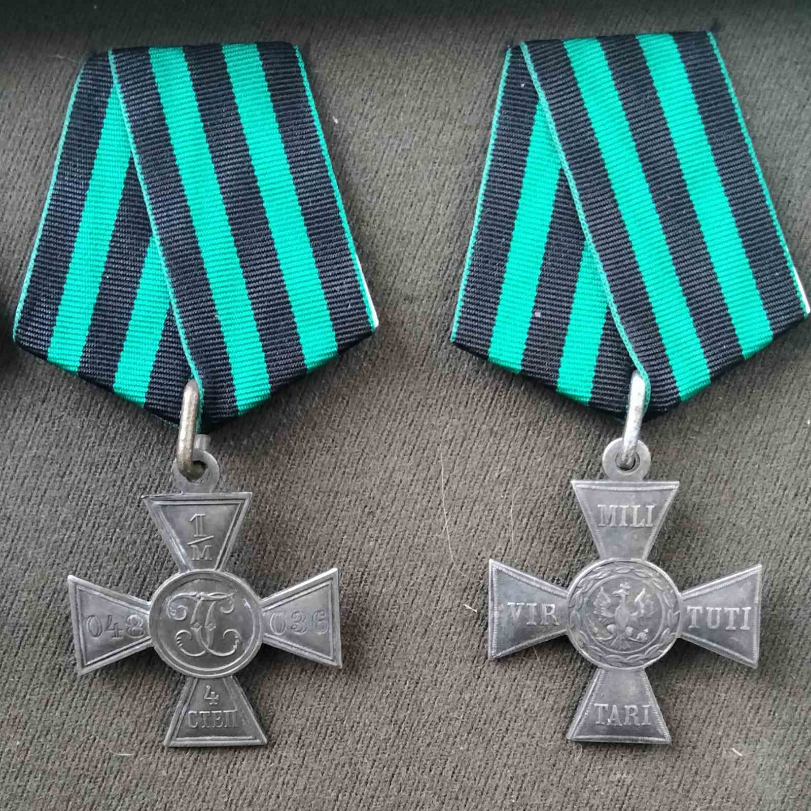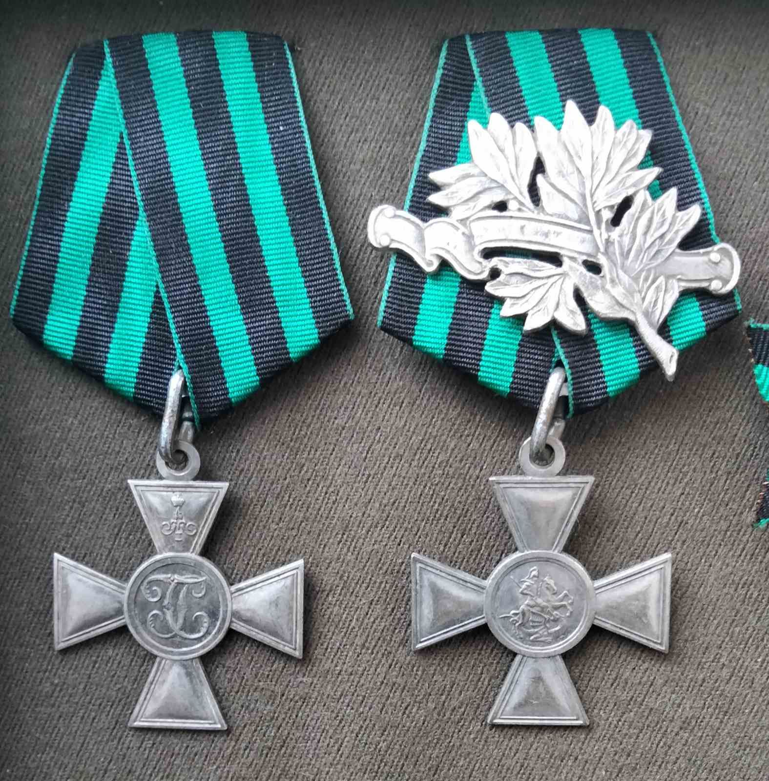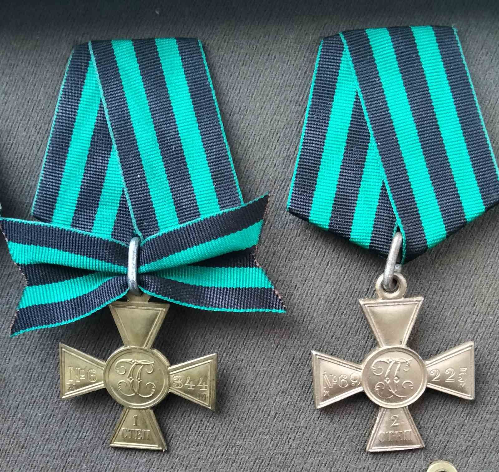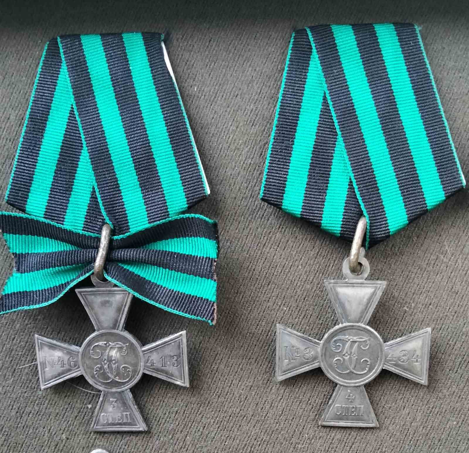 Чотири ступені Хрестів для нижніх чинів (солдатські) 1 і 2 ст золоті, пізніше, з 1917-го з жовтого металу, 3 і 4 ст - срібні, з 17-го з білого металу (мельхіор). 1 і 3 ст. - з бантом на колодці. Нагороди - номерні, велись списки нагороджених, за номером можливо визначити - хто і за що був нагороджений.