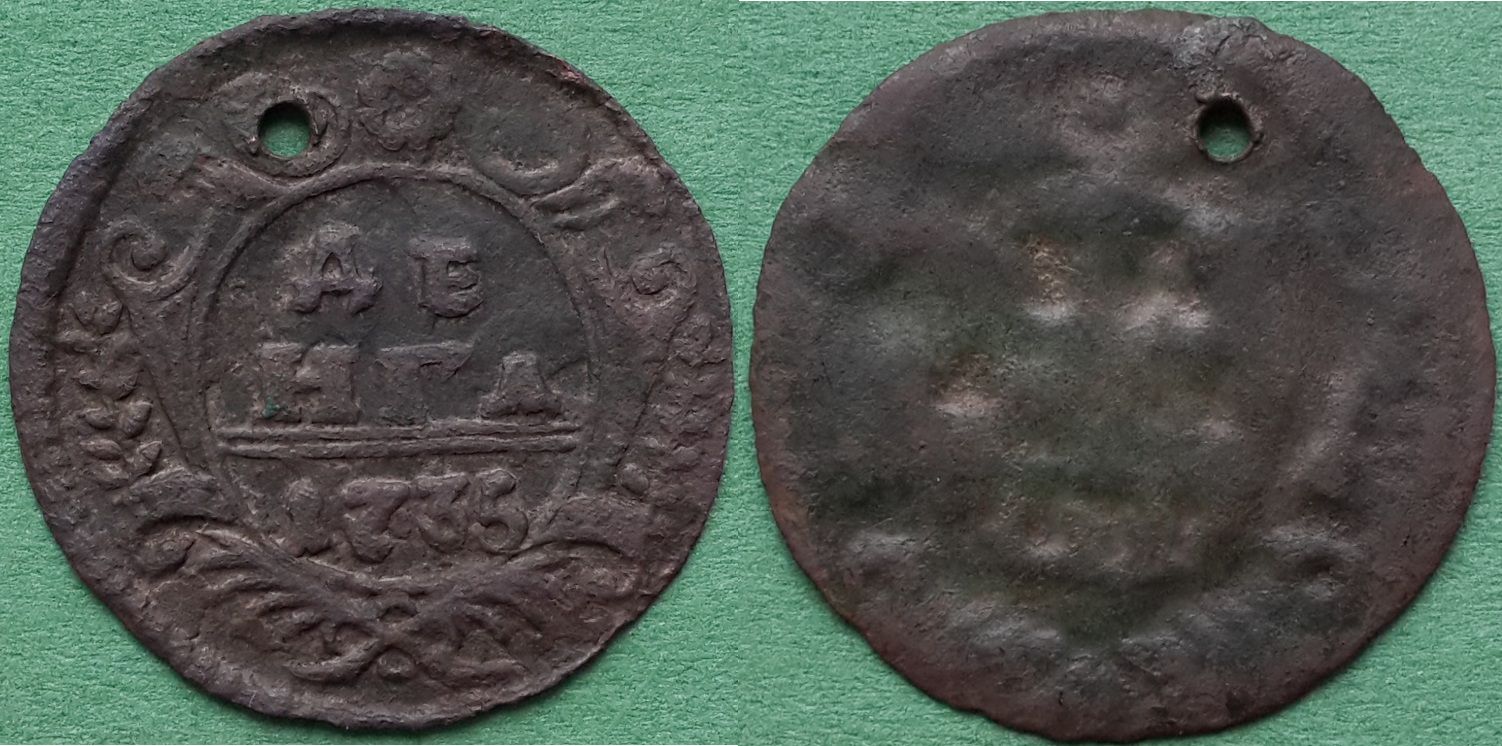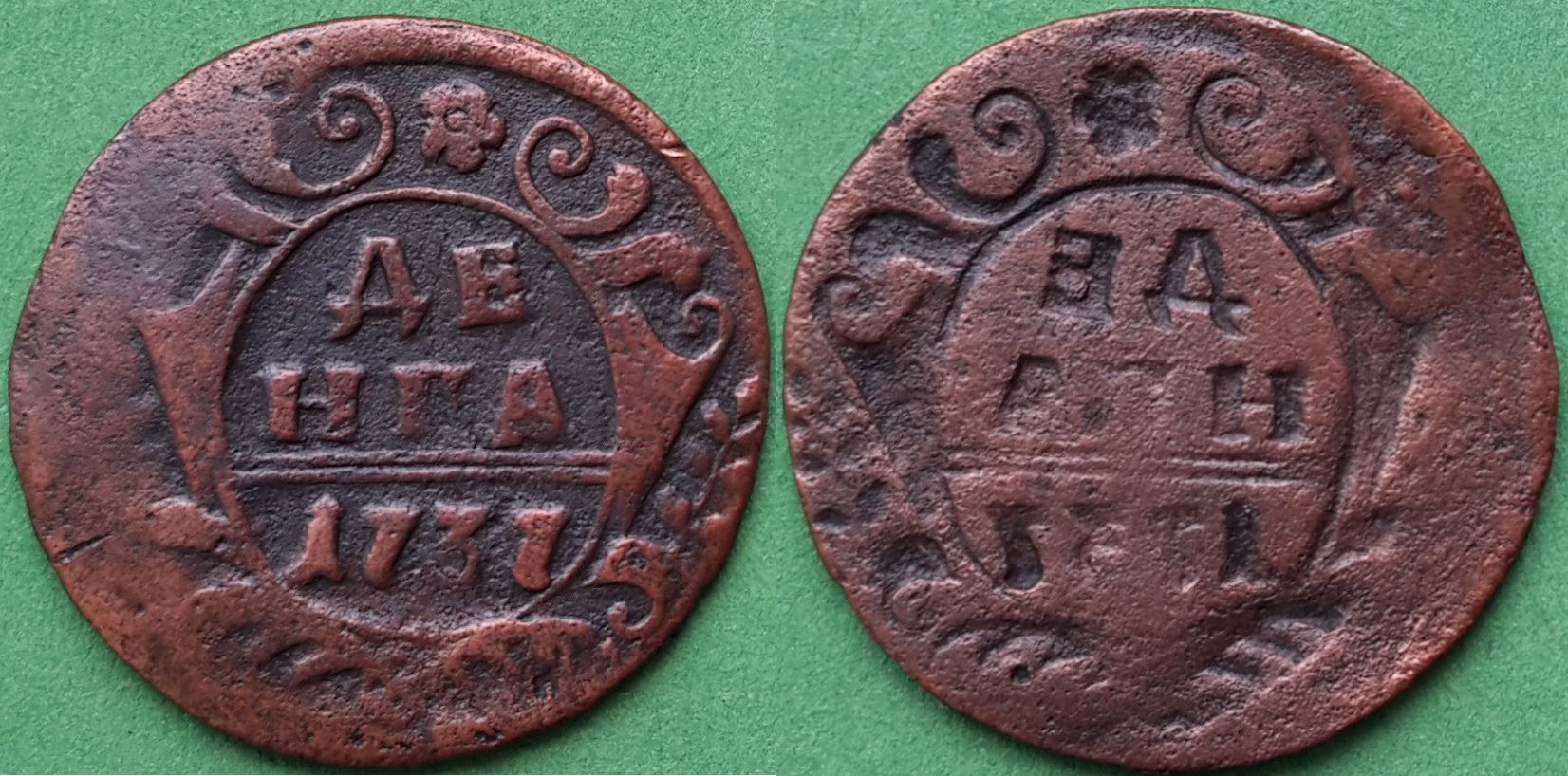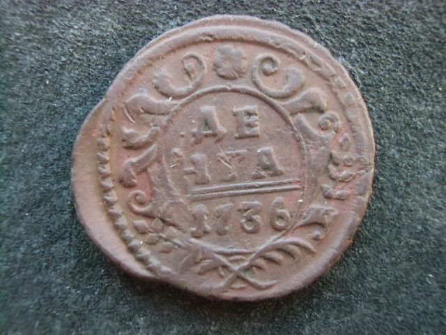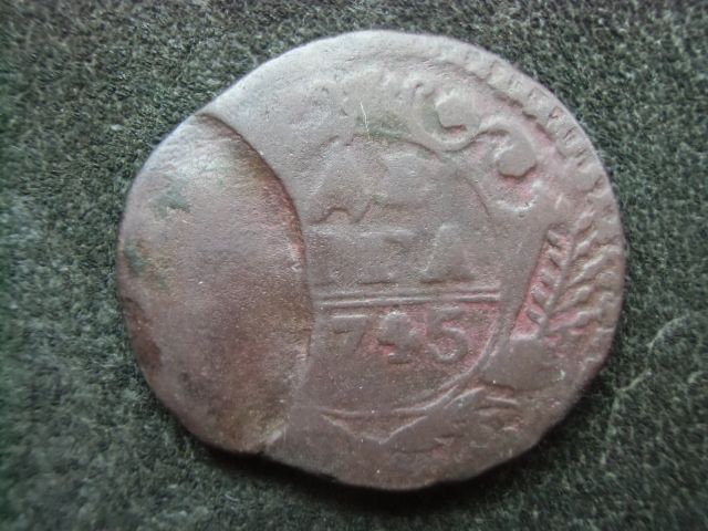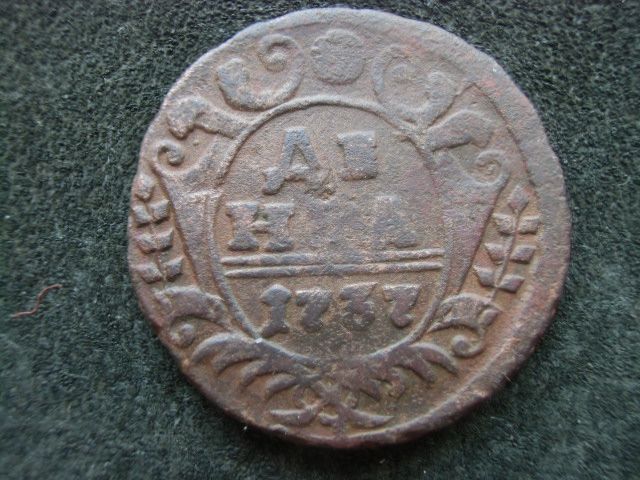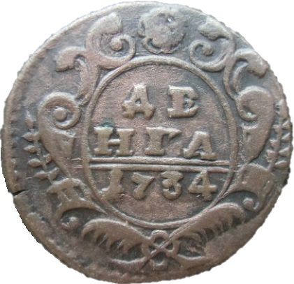 В следствии чего хочу заметить, что данный вид брака позволяет, в каждом конкретном случае, найти одноштемпельную монету. Для примера денга 1734 года.