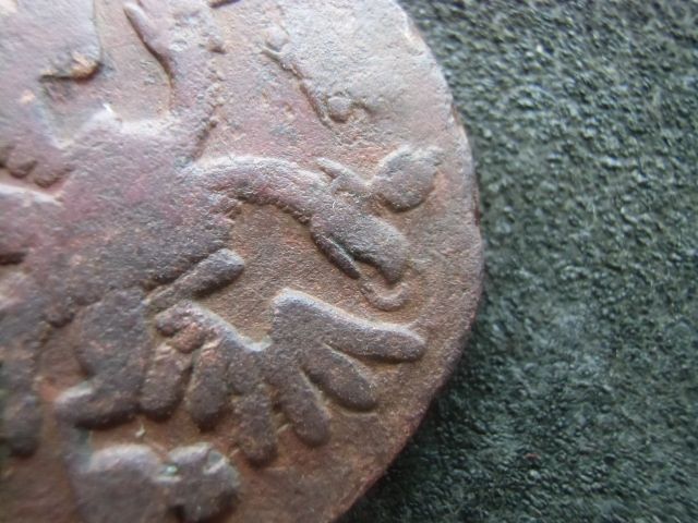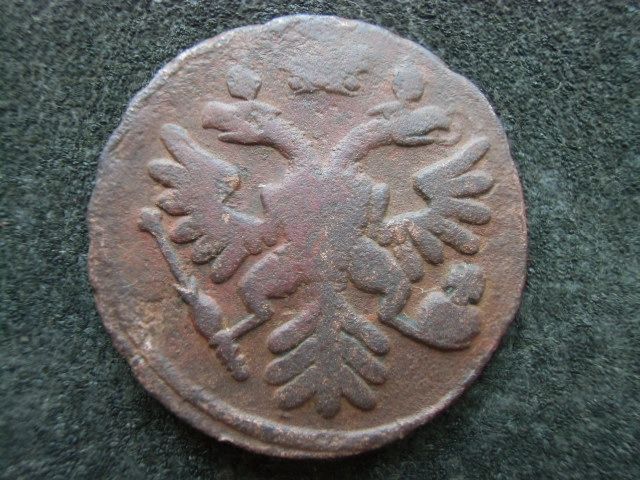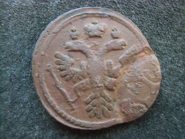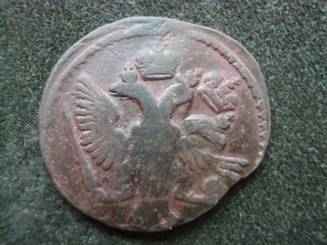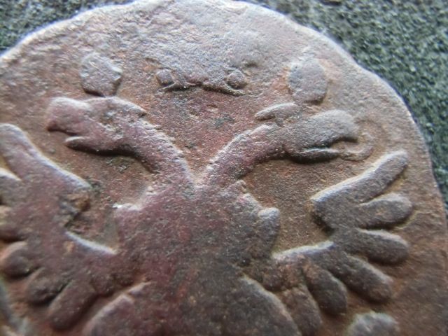 Доброго вечора. :) Интересный, на мой взгляд, монетный брак. Двойной удар деньги 1745 года, в результате которого получился Трехголовый, Дважды коронованный Орел. Фото прилагаю. :shok: :D З повагою.