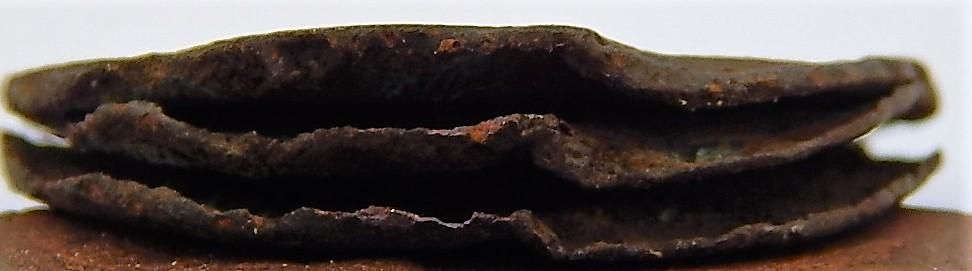 Следует упомянуть и о расслоение металла в результате перегрева и многоразового использования кружка-заготовки или монеты в виде кружка-заготовкипри перечекане. На нижних фото агрессивная среда в которой пребывала монета, довела ее до многократного расслоения. На верхних фото частичное отслоение аверса, на следующих фото отслоение всего рисунка реверса. С уважением.
