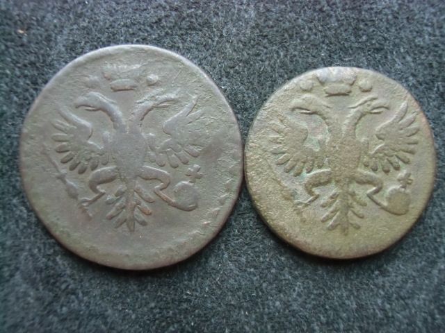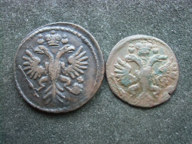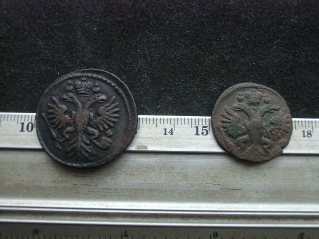 Если брать пример деньги периода 1730-54 годов, то степень редкости монеты может быть увеличена, в случае если монета с обычным вариантом штемпеля отчеканена на нестандартном монетном кружке-заготовке или получена путём перечекана на большом монетном кружке, а так же чекан монет без перегурчивания (деньга с гладким гуртом (без гурта), полушка с узорчатым гуртом). Отдельную категорию представляют собой монеты специфического чекана и монетный брак. Для примера, приведу пару одноштемпельных монет перечеканов с различным диаметром монетного кружка, где как известно копейки Петра Алексеевича выпускаемые на больших кружках были не частыми. Следующая пара монет с максимальным и минимальным диаметром монетного кружка имеющихся в моей коллекции, где хорошо заметна разница в размерах и толщине монетного кружка. С уважением.