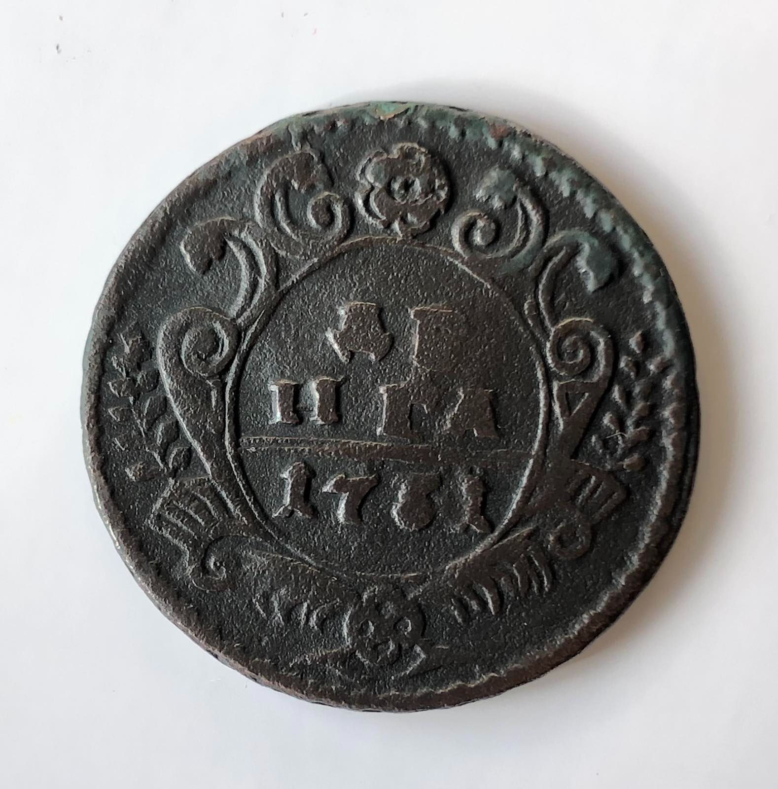 40. Денга 1730 поверх основной розетки набита розетка от полушки 1730 года