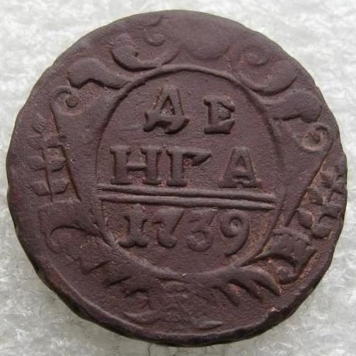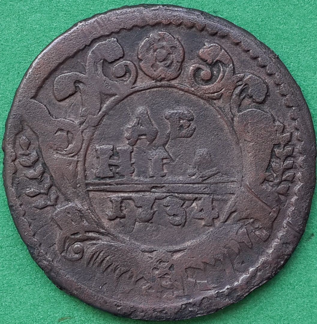 Относительно реверса деньги 1734 года с 3-мя разделительными черточками. Руководство ЦФН у себя обозначила эту монету под №34, хотя не считают такой реверс разновидностью. Фото из Руководства ЦФН и классификацию прилагаю.: 34 - над годом три черты - результат ремонта штемпеля, данный вид брака попадается и в других годах, монета встречается реже, разновидностью не является