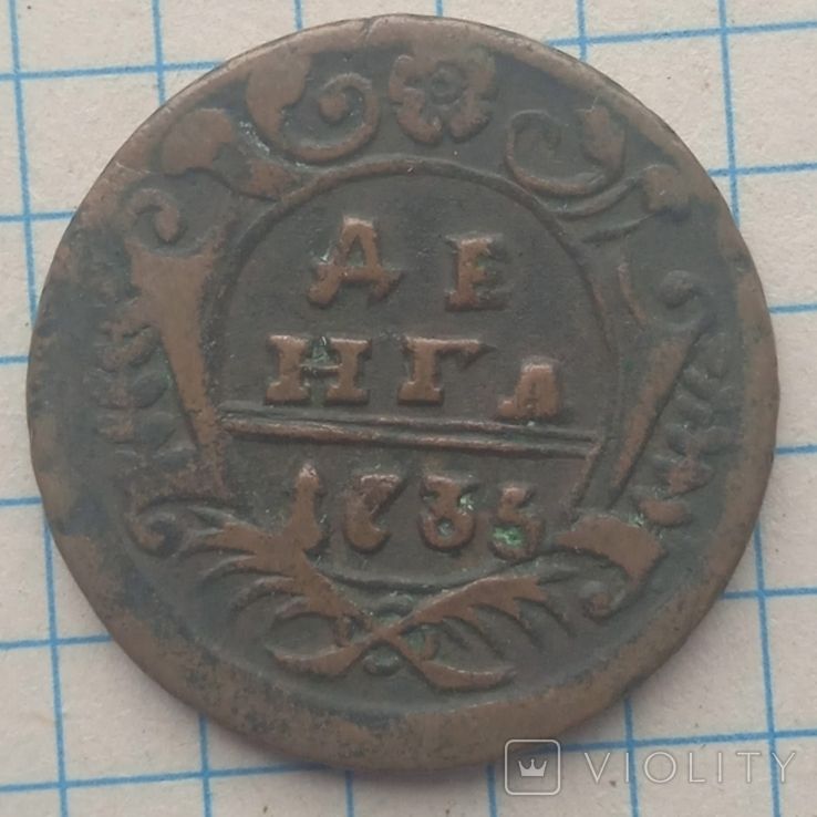 Сегодняшний проход деньги 1735 года. Выпуск Временного монетного двора Плащильная Мельница на р. Яуза, г. Москва. Анна Иоанновна. Разновидность,- орел с языком, ЦФН №7. Гурт сетчатый. Со старта в 1 гривну, через 52 ставки, достигла финишной цены в 668 грн. Проход на украинском аукционе 19.01.2024 года. Фото прилагаю. Руководство ЦФН классифицирует эту разновидность следующим образом: 7 - аверс: орёл образца 1734г., с языками, девять перьев в одном крыле и десять в другом, хвост орла - по три ряда перьев с каждой стороны, крест державы простой, реверс: шаблон №5, розетка образца 1731г., пятилепестковая, внутри в форме гвоздики, боковые ветви - по одиннадцать листочков с каждой стороны, нижние ветви с обвязкой (бантом), монета встречается намного реже. Фото прилагаю. Фото и выписку из Руководства ЦФН прилагаю.