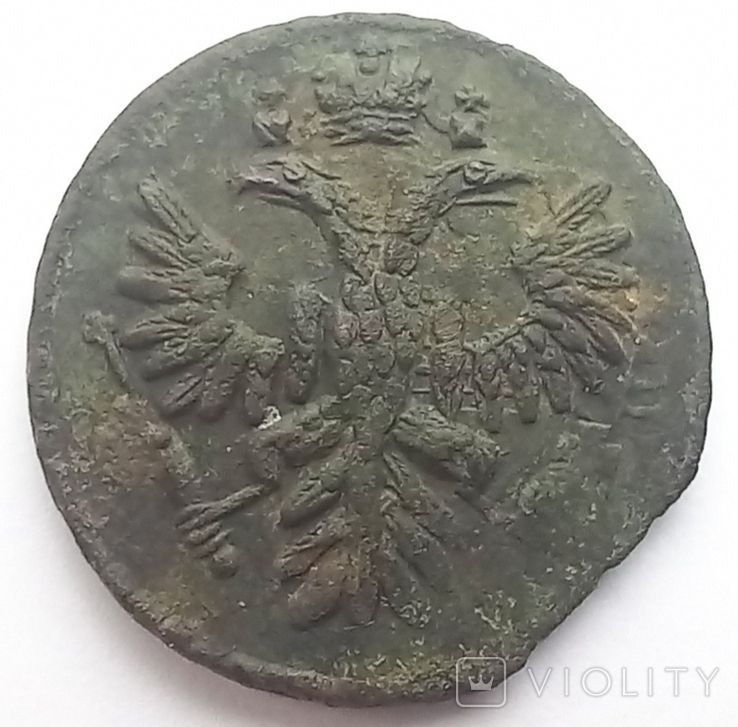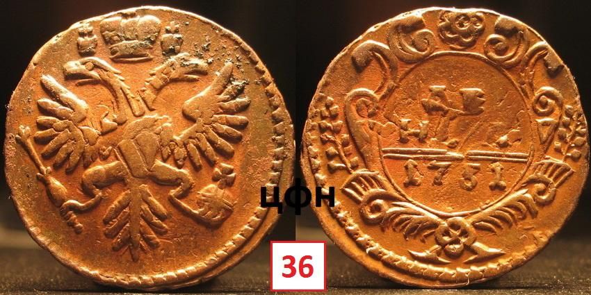 Руководство ЦФН классифицирует эту разновидность деньги следующим образом: 36 - аверс: орёл образца 1730г., девять перьев в одном крыле и десять в другом, хвост орла - по три ряда перьев с каждой стороны, крест державы простой, ости внизу хвоста орла, центральная корона открытая, реверс: шаблон №3, необычная розетка (а народе "фестивальная"), боковые ветви - одиннадцать листочков с одной стороны и девять с другой, нижние ветви пальмовые с обвязкой (бантом), монета встречается намного реже, Фото и выписку из Руководства ЦФН прилагаю.