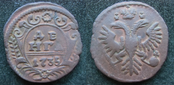 23. Денга 1735 года Орел с языками, ЦФН №7