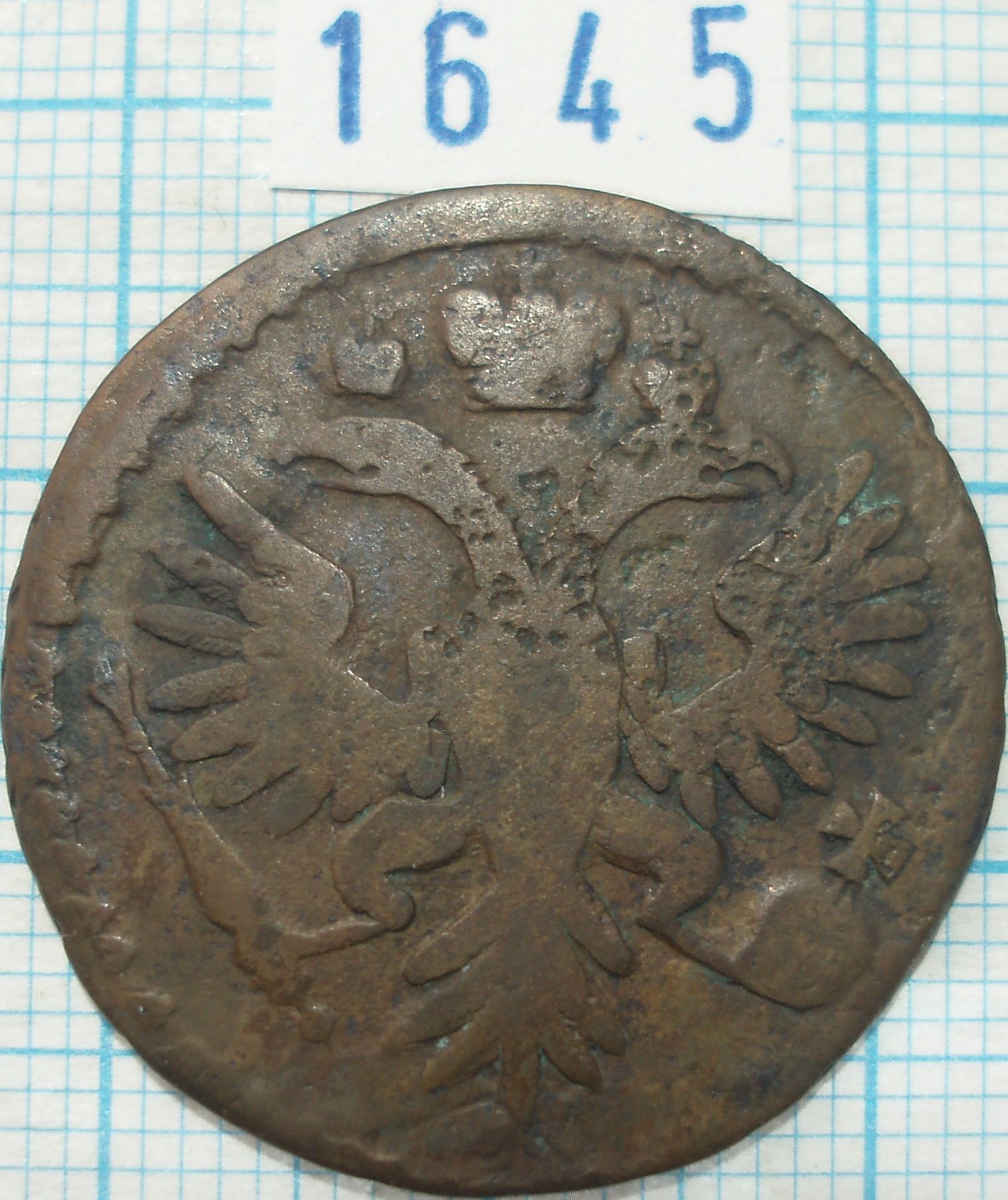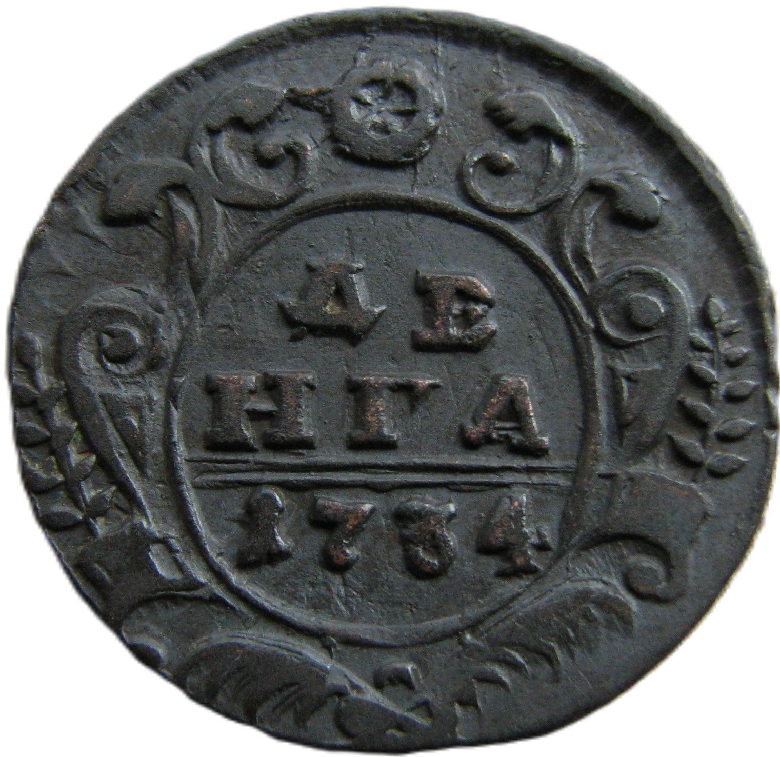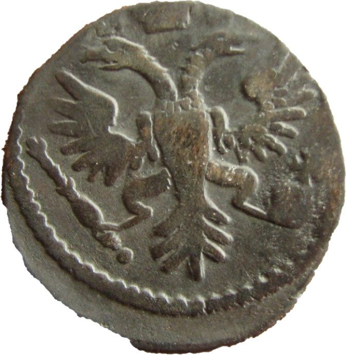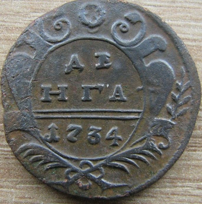 . Олег Евгеньевич для статистики довольно интересный вариант денги 1734 года. в четвертом шаблоне, аверс-по десять перьев в крыльях, ЦК закрытого типа. На ЦФН подходящая под описание аверса есть, это ЦФН №3, аверс подходит под описание но не одноштемпельный, реверс на ЦФН шаблон №1. Так что такой вариант аверс-реверс думаю можно смело считать штемпельной разновидностью. Да и еще, там перебивка розетки, возможно с четырех лепестковой.