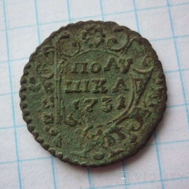 Проход полушки перечекана выпуска Красного монетного двора 1731 года. Под крылом орла видна последняя цифра даты выпуска "Крестовой" копейки 1729 года. Гурт шнуровидный. Со старта в 1 гривну, через 22 ставок, достигла финишной цены в 223 грн. Монета из земли. Проход на украинском аукционе 17.12.2023 года. Фото прилагаю.