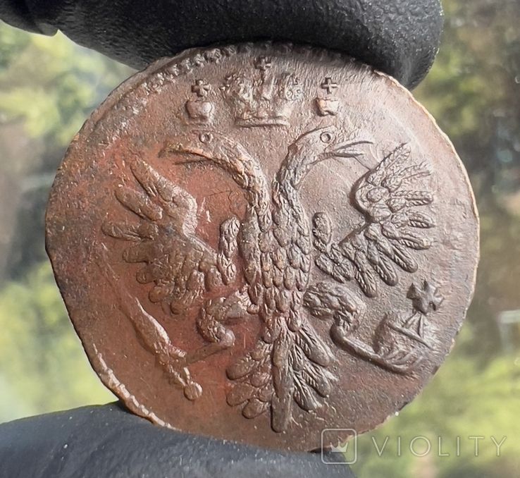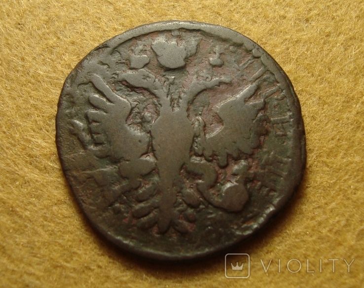 Руководство ЦФН классифицирует эту разновидность деньги следующим образом: 35а - аверс: орёл особого рисунка, образца 1730г., с остями в крыльях, по десять перьев в каждом крыле, хвост орла маленький, по четыре ряда перьев с каждой стороны, крест державы простой, центральная корона открытая, (в народе "толстый", "кислый"), реверс: шаблон №2, розетка пятилепестковая в форме цветка, боковые ветви - тринадцать листочков с одной стороны и одиннадцать с другой, нижние ветви пальмовые с обвязкой (бантом), монета встречается намного реже. Фото и выписку из Руководства ЦФН прилагаю.