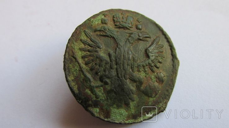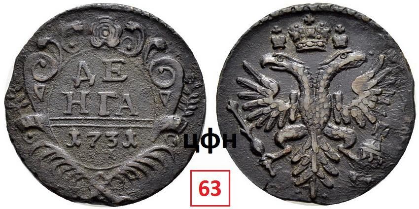 Руководство ЦФН классифицирует эту разновидность деньги следующим образом: №63 - аверс: орёл образца 1730г., девять перьев в одном крыле и десять в другом, хвост орла - по три ряда перьев с каждой стороны, крест державы простой, реверс: внешаблонный, розетка образца 1731г., пятилучевая, необычной формы, (в народе "медуза"), боковые ветви - по десять листочков с каждой стороны, нижние ветви пальмовые с обвязкой (бантом), надписи номинала и года выполнены нестандартным шрифтом, монета встречается редко. Фото и выписку из Руководства ЦФН прилагаю.