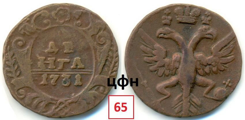 Руководство ЦФН классифицирует эту разновидность деньги следующим образом: 65 - аверс: внешаблонный, орёл образца 1731г., необычного рисунка (в народе "пьяный"), с остями в крыльях и хвосте, по семь перьев в каждом крыле, хвост орла - по два ряда перьев с каждой стороны, реверс: шаблон №1, розетка образца 1730г., пятилепестковая, боковые ветви - девять листочков с одной стороны и двенадцать с другой, нижние ветви пальмовые с обвязкой (бантом), монета встречается редко. Фото и выписку из Руководства ЦФН прилагаю.