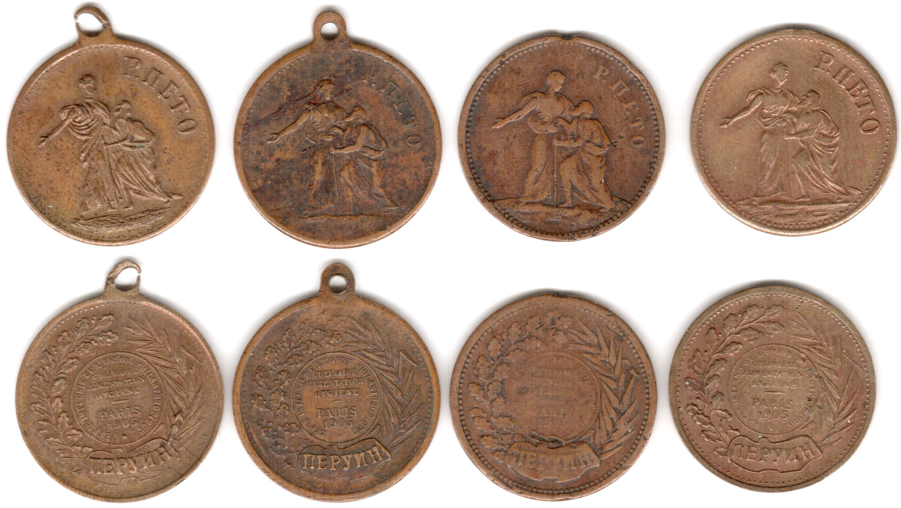В общем же, дизайн «парижской» медали представляет из себя следующее. Аверс – две аллегорические фигуры (женская и мужская), а справа-вверху надпись по-русски –«Р. ПЕТО». На реверсе – в лаврово-дубовом обрамлении находится центральный медальон. В нем – круговая надпись на французском языке: «EXP-ON INTERNIE DE L’UNION PHILANTROPIQUE», разделенная внизу либо звездочкой, либо точкой. В центре медальона пятистрочная французская надпись: «CULINAIRE ALIMENTATION HYGIENE. PARIS. 1905». Внизу на пересечении лаврово-дубового венка расположен фигурный геральдический щиток, на котором и значится название средства – «ПЕРУИН» (в дооктябрьские времена резчики штемпелей, в особенности в частных мастерских, нередко не рассчитывали вырезаемую надпись, из-за чего положенный после согласной на конце слова твердый знак подчас не помещался, на что, как правило, закрывали глаза, т.к. это не нарушало читаемость и смысловую нагрузку слова).