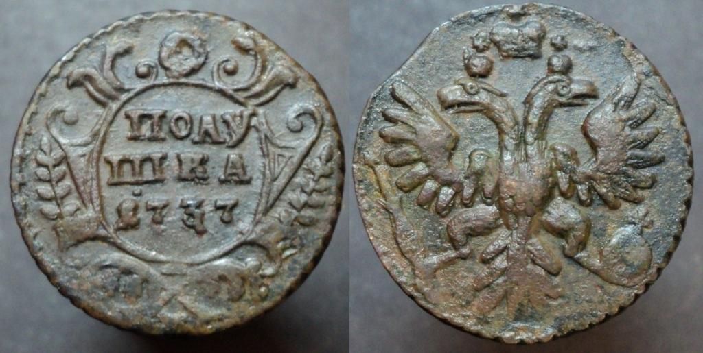 Доброго вечера. Рекордсменка в перевесе 1737 года среди полушек выпуска Красного монетного двора с весом в 5,78 гр., который составляет 140,98%, от установленного среднего веса для полушки в 4,10 гр. Фото прилагаю. С уважением.