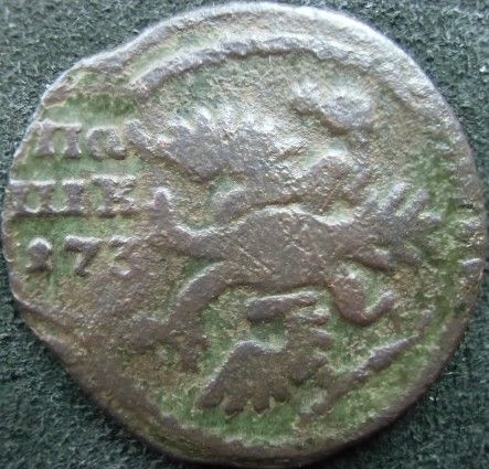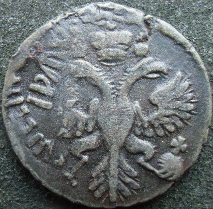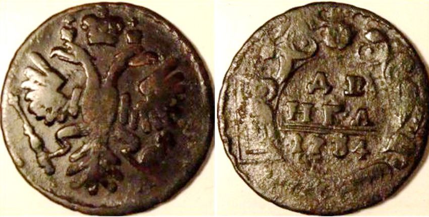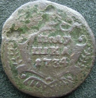 Поздний перечекан деньги 1734 года, со следами "Рамочной" копейки Петра Алексеевича. Очень редкий перечекан даже среди "Рамочных" перечеканов, основная масса которых приходится на 1731 год. Фото прилагаю.