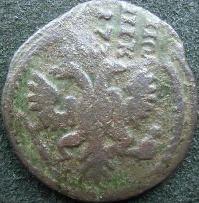 Перечекан деньги 1731 года, реверс 4-го шаблона с явными следами от копейки Петра Алексеевича.